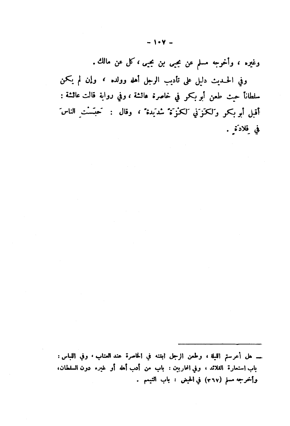 وَفِي الْحَدِيثِ دَلِيلٌ عَلَى تَأْدِيبِ الرَّجُلِ أَهْلَهُ وَوَلَدَهُ، وَإِنْ لَمْ يَكُنْ سُلْطَانًا، حَيْثُ طَعَنَ أَبُو بَكْرٍ فِي خَاصِرَةِ عَائِشَةَ، وَفِي رِوَايَةٍ: قَالَتْ عَائِشَةُ: " أَقْبَلَ أَبُو بَكْرٍ وَلَكَزَنِي لَكْزَةً شَدِيدَةً، وَقَالَ: حَبَسْتِ النَّاسَ فِي قِلادَةٍ ".