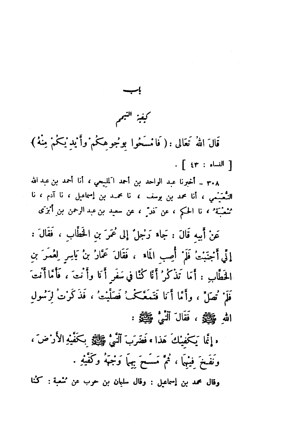 308 - أَخْبَرَنَا عَبْدُ الْوَاحِدِ بْنُ أَحْمَدَ الْمَلِيحِيُّ، أَنا أَحْمَدُ بْنُ عَبْدِ اللَّهِ النُّعَيْمِيُّ، أَنا مُحَمَّدُ بْنُ يُوسُفَ، نَا مُحَمَّدُ بْنُ إِسْمَاعِيلَ، نَا آدَمُ، نَا شُعْبَةُ، نَا الْحَكَمُ، عَنْ ذَرٍّ، عَنْ سَعِيدِ بْنِ عَبْدِ الرَّحْمَنِ بْنِ أَبْزَى، عَنْ أَبِيهِ، قَالَ: جَاءَ رَجُلٌ إِلَى عُمَرَ بْنِ الْخَطَّابِ، فَقَالَ: إِنِّي أَجْنَبْتُ فَلَمْ أُصِبِ الْمَاءَ.