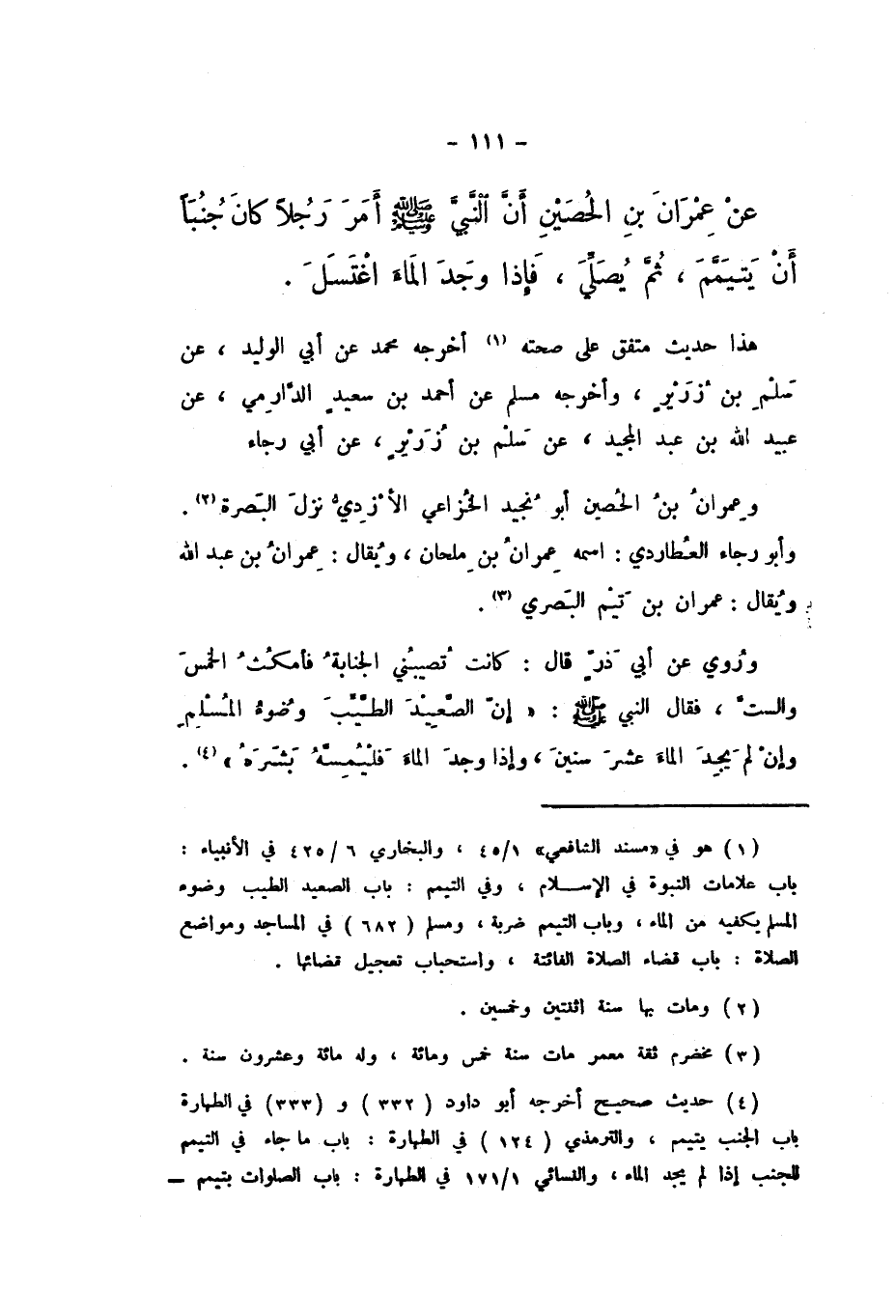 عَنْ عِمْرَانَ بْنِ الْحُصَيْنِ، «أَنَّ النَّبِيَّ صَلَّى اللهُ عَلَيْهِ وَسَلَّمَ أَمَرَ رَجُلا كَانَ جُنُبًا أَنْ يَتَيَمَّمَ، ثُمَّ يُصَلِّيَ، فَإِذَا وَجَدَ الْمَاءَ اغْتَسَلَ».