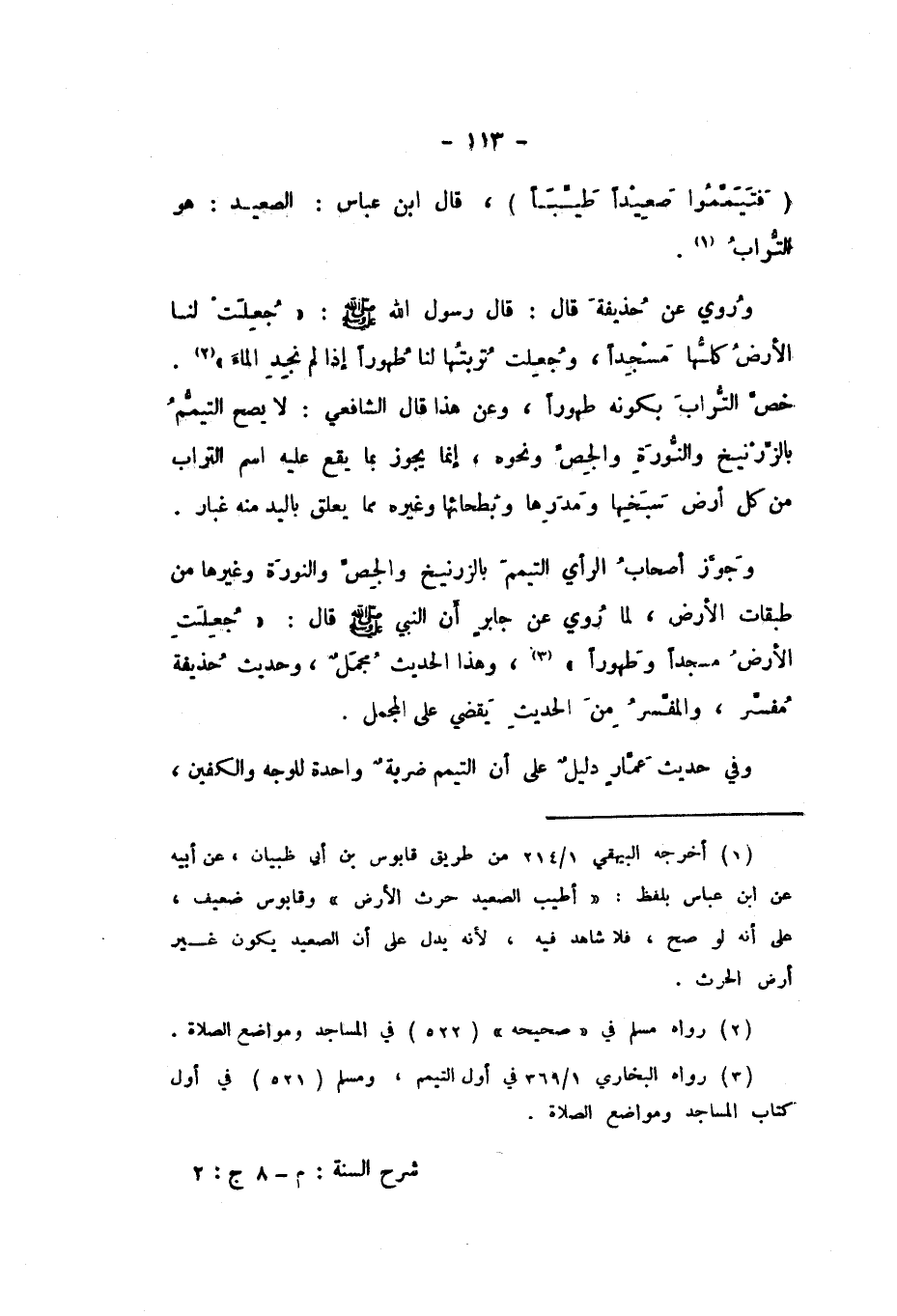 وَرُوِيَ عَنْ حُذَيْفَةَ، قَالَ: قَالَ رَسُولُ اللَّهِ صَلَّى اللهُ عَلَيْهِ وَسَلَّمَ: «جُعِلَتْ لَنَا الأَرْضُ كُلَّهَا مَسْجِدًا، وَجُعِلَتْ تُرْبَتُهَا لَنَا طَهُورًا إِذَا لَمْ نَجِدِ الْمَاءَ».