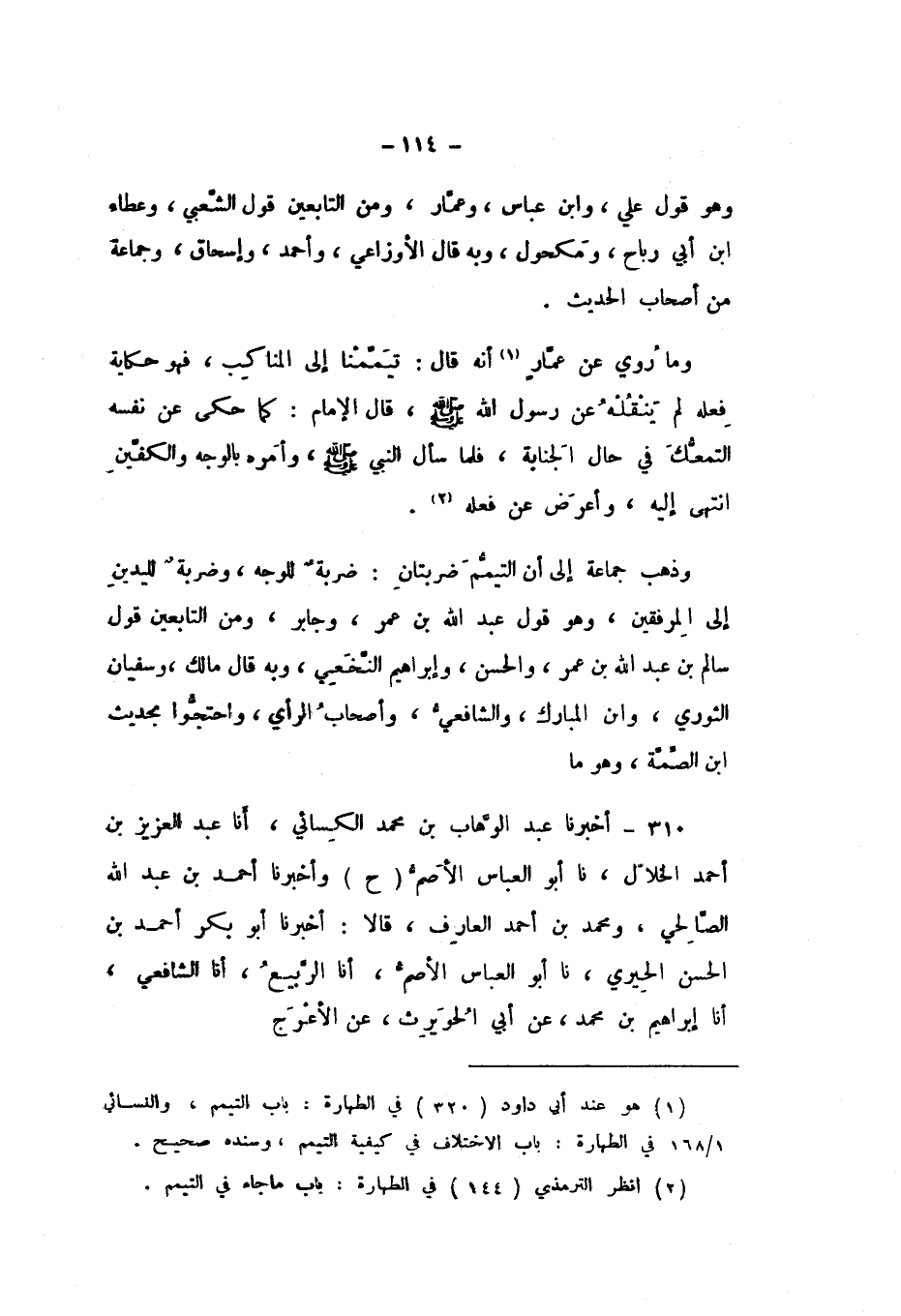 وَمَا رُوِيَ عَنْ عَمَّارٍ، أَنَّهُ قَالَ: «تَيَمَّمْنَا إِلَى الْمَنَاكِبِ» فَهُوَ حِكَايَةُ فِعْلِهِ، لَمْ يَنْقُلْهُ عَنْ رَسُولِ اللَّهِ صَلَّى اللهُ عَلَيْهِ وَسَلَّمَ، قَالَ الإِمَامُ: كَمَا حَكَى عَنْ نَفْسِهِ التَّمَعُّكَ فِي حَالِ الْجَنَابَةِ، فَلَمَّا سَأَلَ النَّبِيَّ صَلَّى اللهُ عَلَيْهِ وَسَلَّمَ، وَأَمَرَهُ بِالْوَجْهِ وَالْكَفَّيْنِ انْتَهَى إِلَيْهِ، وَأَعْرَضَ عَنْ فِعْلِهِ.