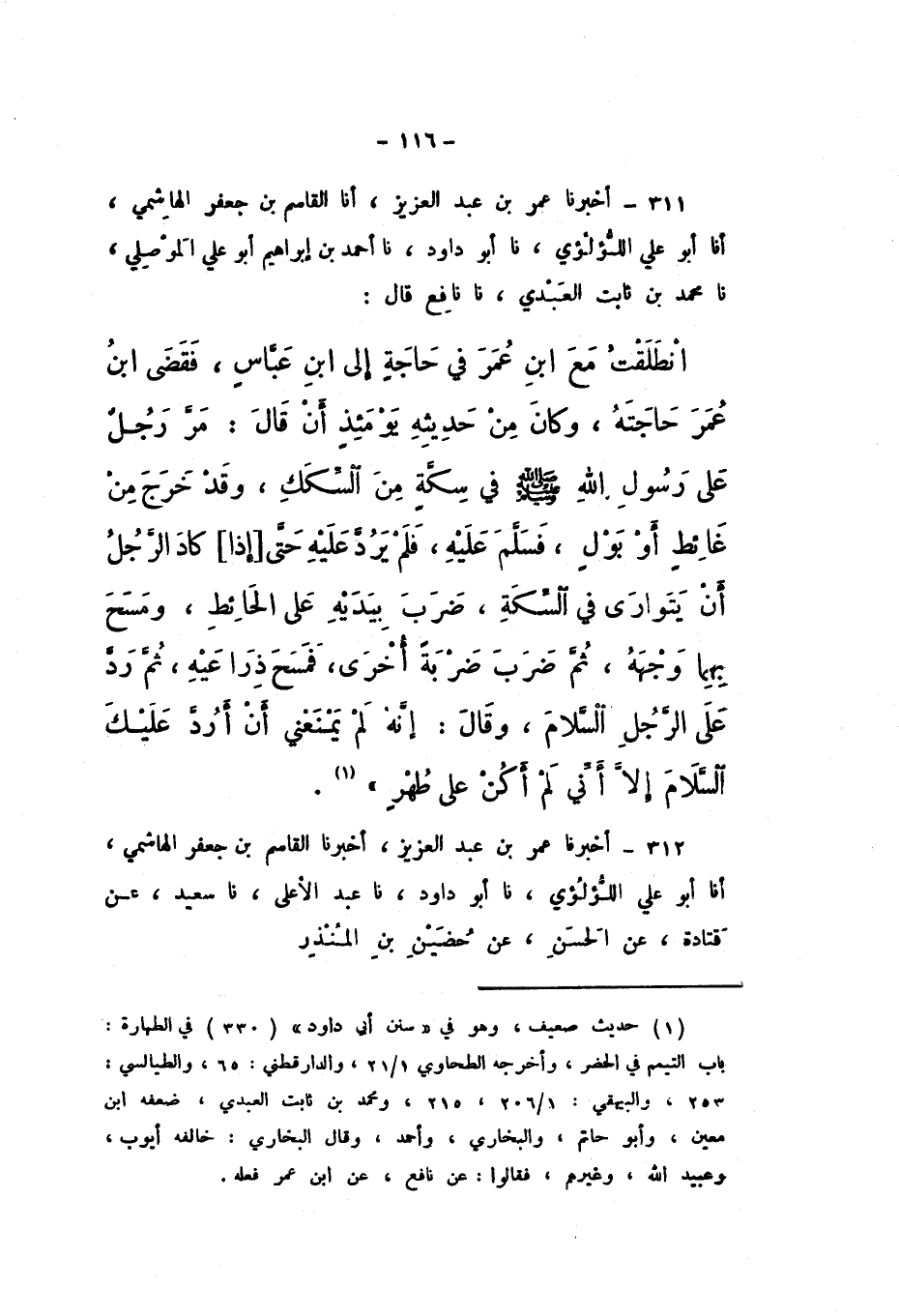311 - أَخْبَرَنَا عُمَرُ بْنُ عَبْدِ الْعَزِيزِ، أَنا الْقَاسِمُ بْنُ جَعْفَرٍ الْهَاشِمِيُّ، أَنا أَبُو عَلِيٍّ اللُّؤْلُئِيُّ، نَا أَبُو دَاوُدَ، نَا أَحْمَدُ بْنُ إِبْرَاهِيمَ أَبُو عَلِيٍّ الْمَوْصِلِيُّ، نَا مُحَمَّدُ بْنُ ثَابِتٍ الْعَبْدِيُّ، نَا نَافِعٌ، قَالَ: انْطَلَقْتُ مَعَ ابْنِ عُمَرَ فِي حَاجَةٍ إِلَى ابْنِ عَبَّاسٍ، فَقَضَى ابْنُ عُمَرَ حَاجَتَهُ، وَكَانَ مِنْ حَدِيثِهِ يَوْمَئِذٍ أَنْ قَالَ: " مَرَّ رَجُلٌ عَلَى رَسُولِ اللَّهِ صَلَّى اللهُ عَلَيْهِ وَسَلَّمَ فِي سِكَّةٍ مِنَ السِّكَكِ، وَقَدْ خَرَجَ مِنْ غَائِطٍ أَوْ بَوْلٍ، فَسَلَّمَ عَلَيْهِ، فَلَمْ يَرُدَّ عَلَيْهِ حَتَّى كَادَ الرَّجُلُ أَنْ يَتَوَارَى فِي السِّكَّةِ، ضَرَبَ بِيَدَيْهِ عَلَى الْحَائِطِ، وَمَسَحَ بِهِمَا وَجْهَهُ، ثُمَّ ضَرَبَ ضَرْبَةً أُخْرَى، فَمَسَحَ ذِرَاعَيْهِ، ثُمَّ رَدَّ عَلَى الرَّجُلِ السَّلامَ، وَقَالَ: إِنَّهُ لَمْ يَمْنَعْنِي أَنْ أَرُدَّ عَلَيْكَ السَّلامَ إِلا أَنِّي لَمْ أَكُنْ عَلَى طُهْرٍ "