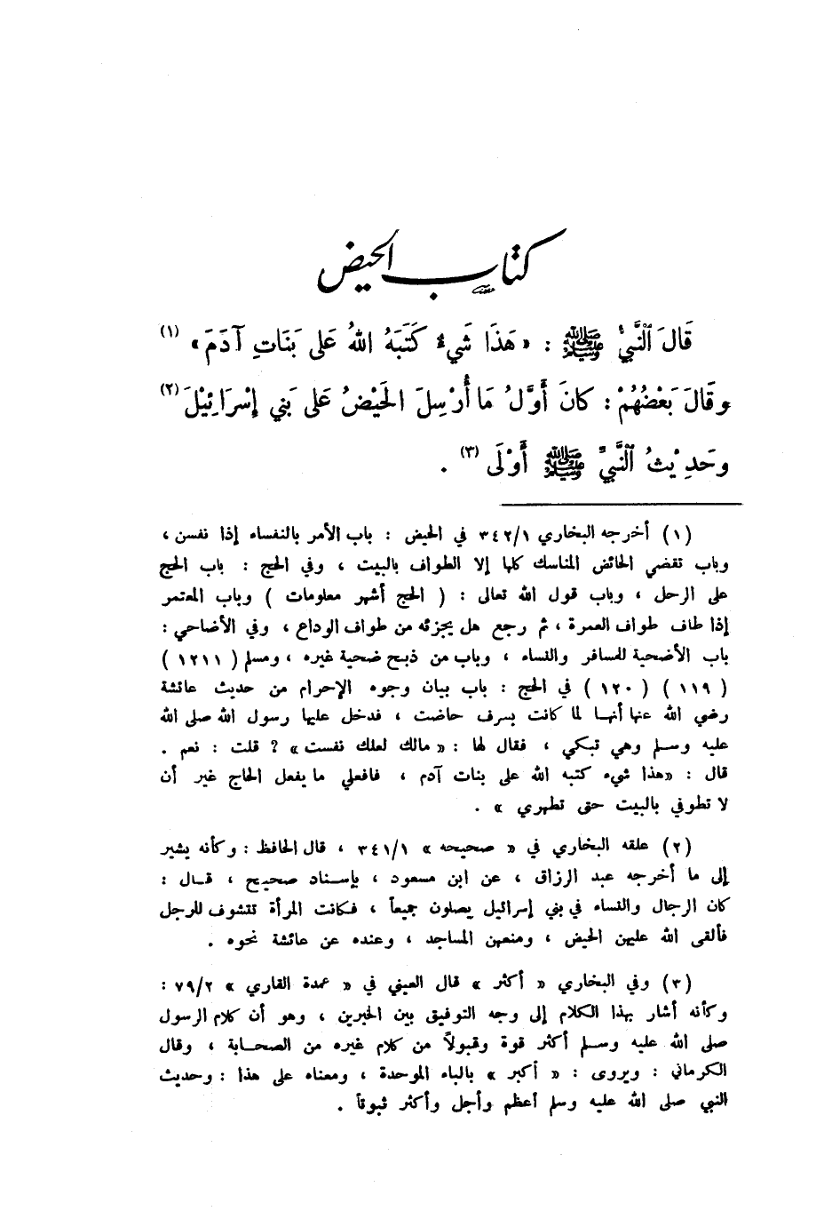 قَالَ النَّبِيُّ صَلَّى اللهُ عَلَيْهِ وَسَلَّمَ: «هَذَا شَيْءٌ كَتَبَهُ اللَّهُ عَلَى بَنَاتِ آدَمَ»، وَقَالَ بَعْضُهُمْ: كَانَ أَوَّلُ مَا أُرْسِلَ الْحَيْضُ عَلَى بَنِي إِسْرَائِيلَ.
