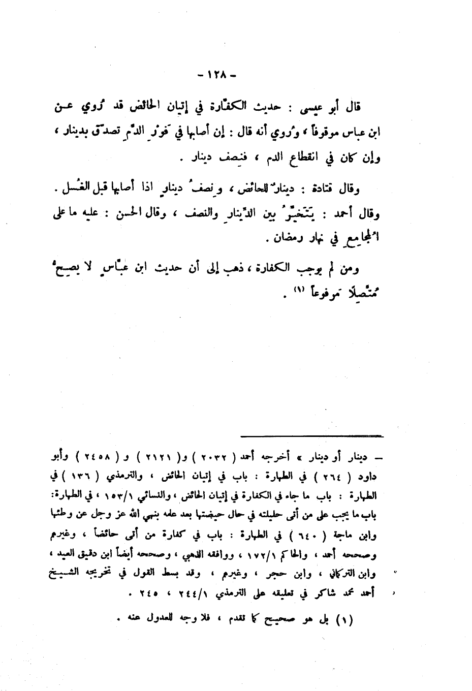 قَالَ أَبُو عِيسَى: حَدِيثُ الْكَفَّارَةِ فِي إِتْيَانِ الْحَائِضِ قَدْ رُوِيَ عَنِ ابْنِ عَبَّاسٍ، مَوْقُوفًا، وَرُوِيَ أَنَّهُ قَالَ: «إِنْ أَصَابَهَا فِي فَوْرِ الدَّمِ تَصَدَّقَ بِدِينَارٍ، وَإِنْ كَانَ فِي انْقِطَاعِ الدَّمِ، فَنِصْفُ دِينَارٍ».