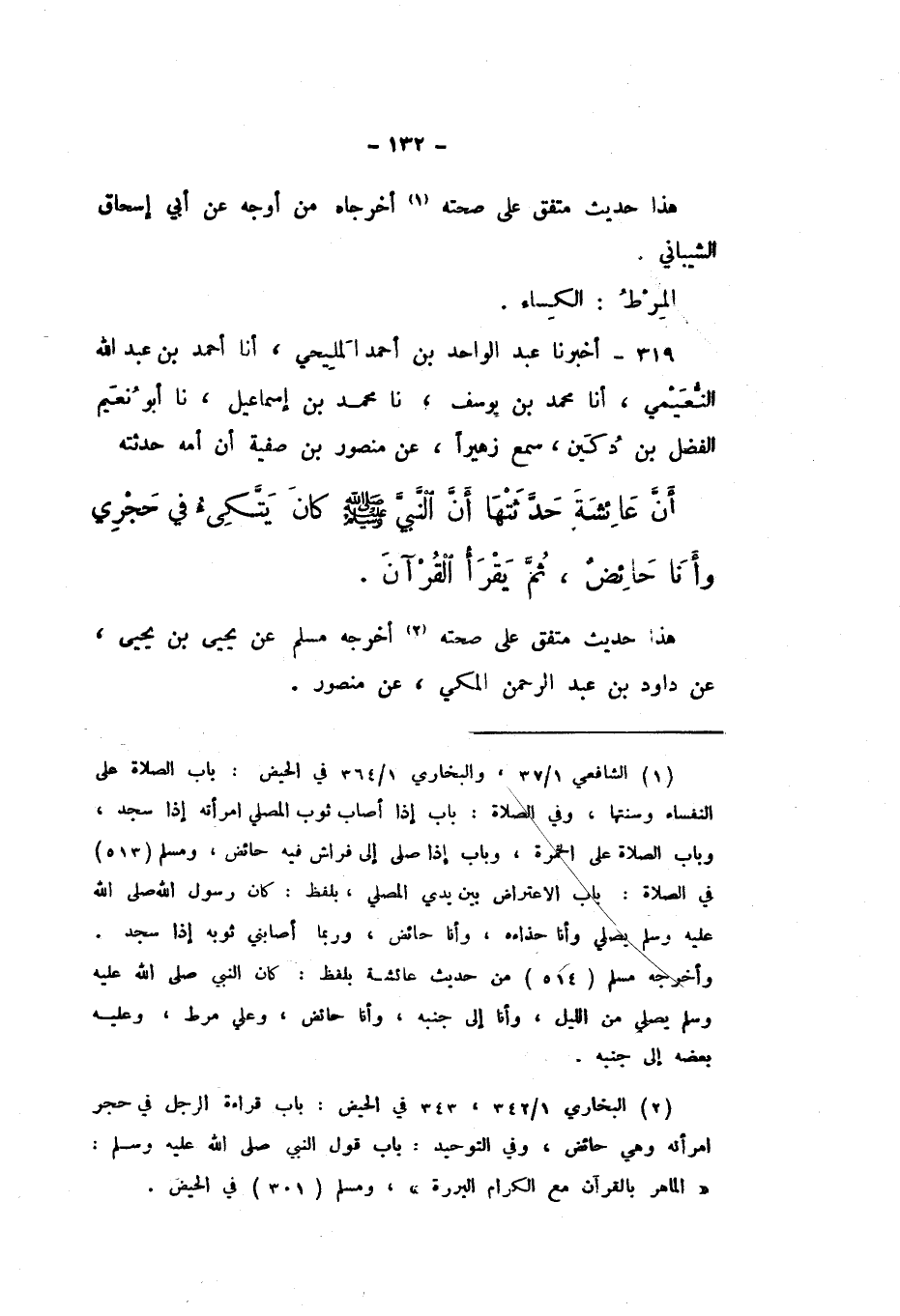 319 - أَخْبَرَنَا عَبْدُ الْوَاحِدِ بْنُ أَحْمَدَ الْمَلِيحِيُّ، أَنا أَحْمَدُ بْنُ عَبْدِ اللَّهِ النُّعَيْمِيُّ، أَنا مُحَمَّدُ بْنُ يُوسُفَ، نَا مُحَمَّدُ بْنُ إِسْمَاعِيلَ، نَا أَبُو نُعَيْمٍ الْفَضْلُ بْنُ دُكَيْنٍ، سَمِعَ زُهَيْرًا، عَنْ مَنْصُورِ بْنِ صَفِيَّةَ، أَنَّ أُمَّهُ حَدَّثَتْهُ، أَنَّ عَائِشَةَ حَدَّثَتْهَا «أَنَّ النَّبِيَّ صَلَّى اللهُ عَلَيْهِ وَسَلَّمَ كَانَ يَتَّكِئُ فِي حجري وَأَنَا حَائِضٌ، ثُمَّ يَقْرَأُ الْقُرْآنَ».