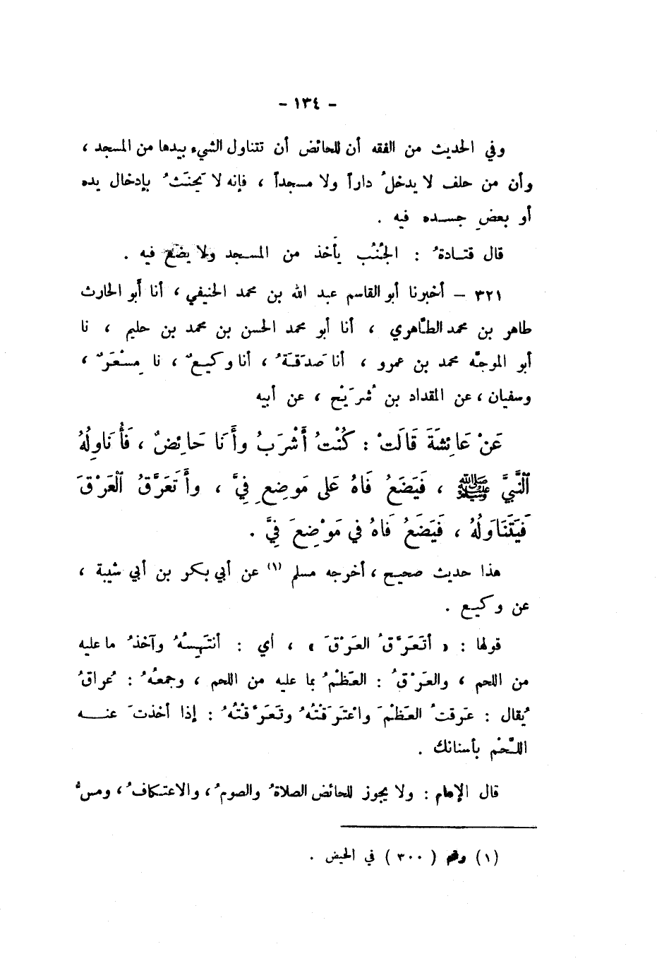 321 - أَخْبَرَنَا أَبُو الْقَاسِمِ عَبْدُ اللَّهِ بْنُ مُحَمَّدٍ الْحَنِيفِيُّ، أَنا أَبُو الْحَارِثِ طَاهِرُ بْنُ مُحَمَّدٍ الطَّاهِرِيُّ، أَنا أَبُو مُحَمَّدٍ الْحَسَنُ بْنُ مُحَمَّدِ بْنِ حَلِيمٍ، نَا أَبُو الْمُوَجِّهِ مُحَمَّدُ بْنُ عَمْرٍو، أَنا صَدَقَةُ، أَنا وَكِيعٌ، نَا مِسْعَرٌ، وَسُفْيَانُ، عَنِ الْمِقْدَادِ بْنِ شُرَيْحٍ، عَنْ أَبِيهِ، عَنْ عَائِشَةَ، قَالَتْ: «كُنْتُ أَشْرَبُ وَأَنَا حَائِضٌ، فَأُنَاوِلُهُ النَّبِيَّ صَلَّى اللهُ عَلَيْهِ وَسَلَّمَ، فَيَضَعُ فَاهُ عَلَى مَوْضِعِ فِيَّ، وَأَتَعَرَّقُ الْعرق فَيَتَنَاوَلُهُ، فَيَضَعُ فَاهُ فِي مَوْضِعِ فِيَّ».
