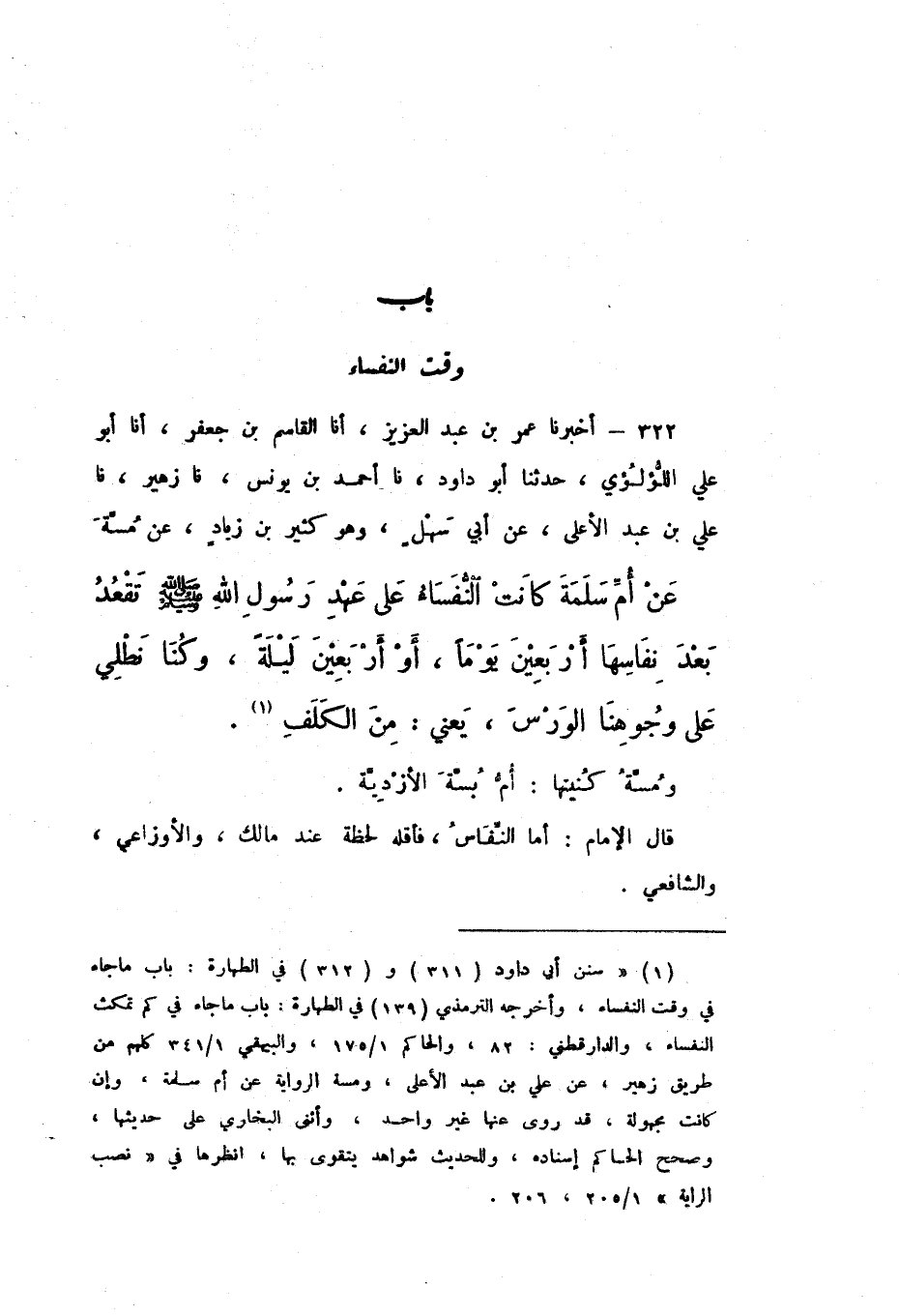 322 - أَخْبَرَنَا عُمَرُ بْنُ عَبْدِ الْعَزِيزِ، أَنا الْقَاسِمُ بْنُ جَعْفَرٍ، أَنا أَبُو عَلِيٍّ اللُّؤْلُئِيُّ، حَدَّثَنَا أَبُو دَاوُدَ، نَا أَحْمَدُ بْنُ يُونُسَ، نَا زُهَيْرٌ، نَا عَلِيُّ بْنُ عَبْدِ الأَعْلَى، عَنْ أَبِي سَهْلٍ وَهُوَ كَثِيرُ بْنُ زِيَادٍ، عَنْ مُسَّةَ، عَنْ أُمِّ سَلَمَةَ، «كَانَتِ النُّفَسَاءُ عَلَى عَهْدِ رَسُولِ اللَّهِ صَلَّى اللهُ عَلَيْهِ وَسَلَّمَ تَقْعُدُ بَعْدَ نِفَاسِهَا أَرْبَعِينَ يَوْمًا، أَوْ أَرْبَعِينَ لَيْلَةً، وَكُنَّا نَطْلِي عَلَى وُجُوهِنَا الْوَرْسَ»، يَعْنِي: مِنَ الْكَلَفِ