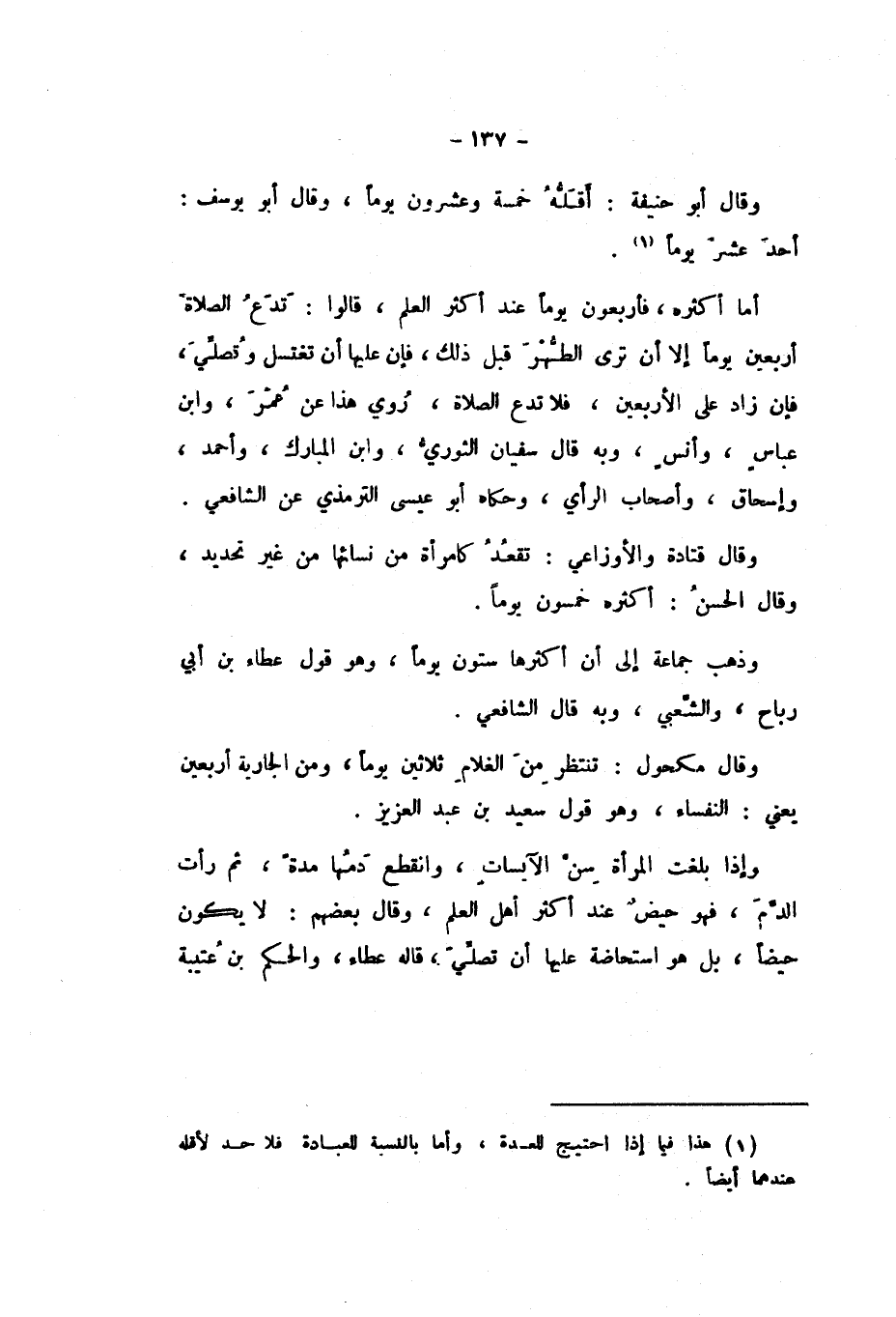 أَمَّا أَكْثَرُهُ، فَأَرْبَعُونَ يَوْمًا عِنْدَ أَكْثَرِ أَهْلِ الْعِلْمِ، قَالُوا: تَدَعُ الصَّلاةَ أَرْبَعِينَ يَوْمًا إِلا أَنْ تَرَى الطُّهْرَ قَبْلَ ذَلِكَ، فَإِنَّ عَلَيْهَا أَنْ تَغْسِلَهَا وَتُصَلِّيَ فَإِنْ زَادَ عَلَى الأَرْبَعِينَ، فَلا تَدَعُ الصَّلاةَ، رُوِيَ هَذَا عَنْ عُمَرَ، وَابْنِ عَبَّاسٍ، وَأَنَسٍ، وَبِهِ قَالَ سُفْيَانُ الثَّوْرِيُّ، وَابْنُ الْمُبَارَكِ، وَأَحْمَدُ، وَإِسْحَاقُ، وَأَصْحَابُ الرَّأْيِ، وَحَكَاهُ أَبُو عِيسَى التِّرْمِذِيُّ عَنِ الشَّافِعِيِّ.
