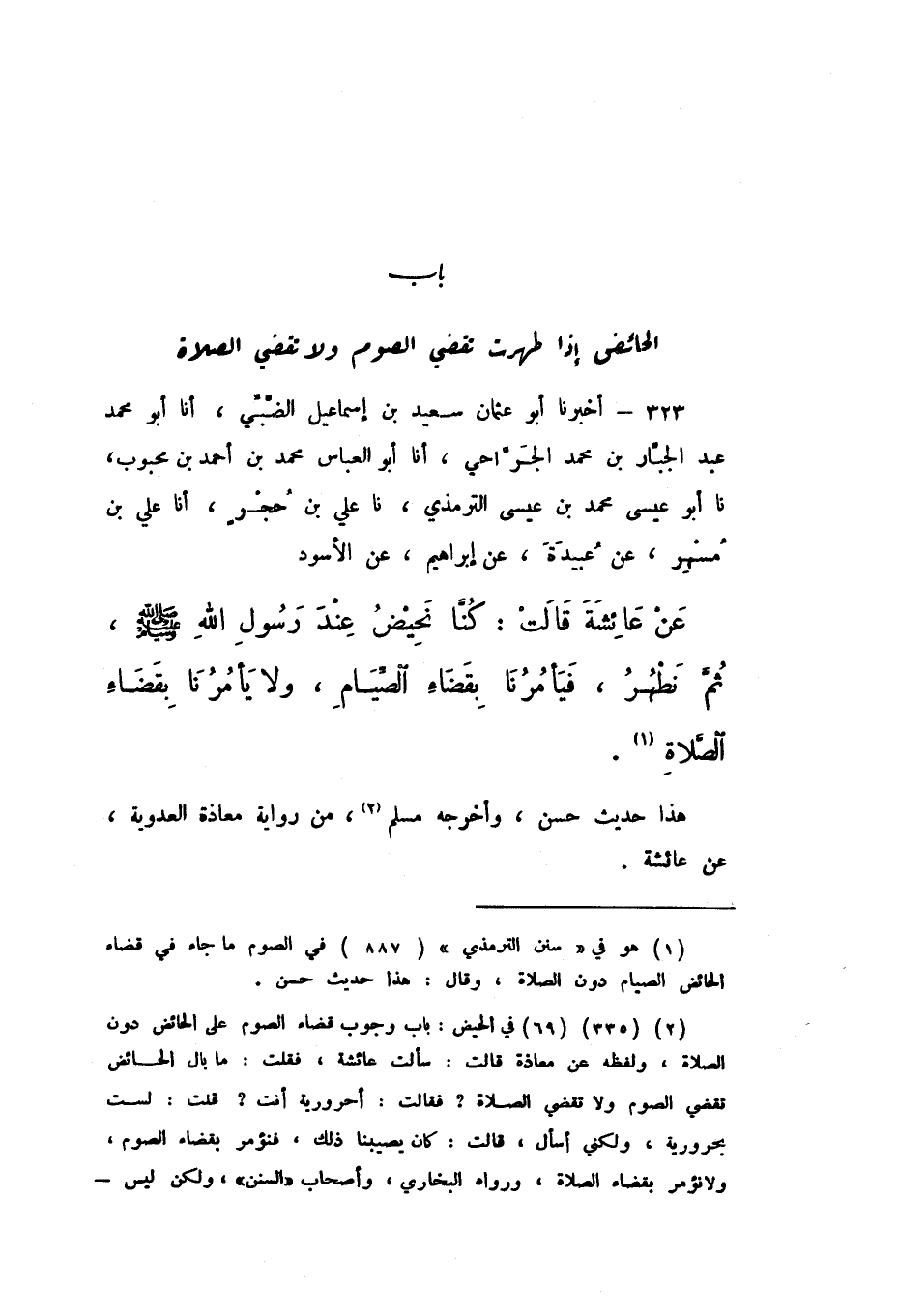 323 - أَخْبَرَنَا أَبُو عُثْمَانَ سَعِيدُ بْنُ إِسْمَاعِيلَ الضَّبِّيُّ، أَنا أَبُو مُحَمَّدٍ عَبْدُ الْجَبَّارِ بْنُ مُحَمَّدٍ الْجَرَّاحِيُّ، أَنا أَبُو الْعَبَّاسِ مُحَمَّدُ بْنُ أَحْمَدَ بْنِ مَحْبُوبٍ، نَا أَبُو عِيسَى مُحَمَّدُ بْنُ عِيسَى التِّرْمِذِيُّ، نَا عَلِيُّ بْنُ حُجْرٍ، أَنا عَلِيُّ بْنُ مُسْهِرٍ، عَنْ عُبَيْدَةَ، عَنْ إِبْرَاهِيمَ، عَنِ الأَسْوَدِ، عَنْ عَائِشَةَ، قَالَتْ: «كُنَّا نَحِيضُ عِنْدَ رَسُولِ اللَّهِ صَلَّى اللهُ عَلَيْهِ وَسَلَّمَ، ثُمَّ نَطْهُرُ، فَيَأْمُرُنَا بِقَضَاءِ الصِّيَامِ، وَلا يَأْمُرُنَا بِقَضَاءِ الصَّلاةِ» هَذَا حَدِيثٌ حَسَنٌ، وَأَخْرَجَهُ مُسْلِمٌ، مِنْ رِوَايَةِ مُعَاذَةَ الْعَدَوِيَّةِ، عَنْ عَائِشَةَ