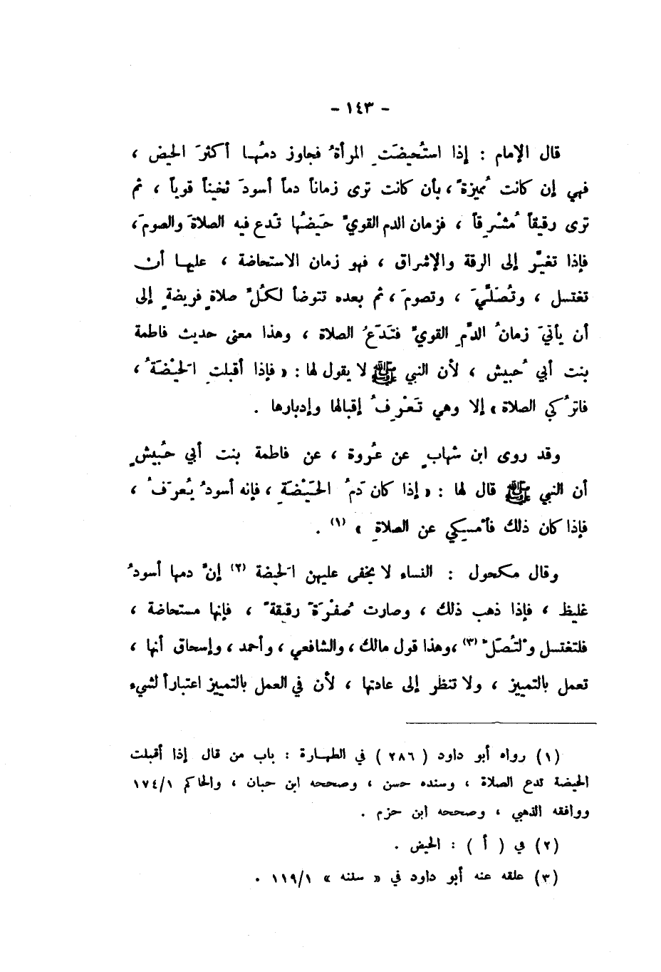 قَالَ الإِمَامُ: إِذَا اسْتُحِيضَتِ الْمَرْأَةُ فَجَاوَزَ دَمُهَا أَكْثَرَ الْحَيْضِ، فَهِيَ إِنْ كَانَتْ مُمَيِّزَةً بِأَنْ كَانَتْ تَرَى زَمَانًا دَمًا أَسْوَدَ ثَخِينًا قَوِيًّا، ثُمَّ تَرَى رَقِيقًا مُشْرِقًا، فَزَمَانُ الدَّمِ الْقَوِيِّ حَيْضُهَا تَدَعُ فِيهِ الصَّلاةَ وَالصَّوْمَ، فَإِذَا تَغَيَّرَ إِلَى الرِّقَّةِ وَالإِشْرَاقِ، فَهُوَ زَمَانُ الاسْتِحَاضَةِ، عَلَيْهَا أَنْ تَغْتَسِلَ، وَتُصَلِّيَ، وَتَصُومَ، ثُمَّ بَعْدَهُ تَتَوَضَّأُ لِكُلِّ صَلاةٍ فَرِيضَةٍ إِلَى أَنْ يَأْتِيَ زَمَانُ الدَّمِ الْقَوِيِّ فَتَدَعُ الصَّلاةَ، وَهَذَا مَعْنَى حَدِيثِ فَاطِمَةَ بِنْتِ أَبِي حُبَيْشٍ، لأَنَّ النَّبِيَّ صَلَّى اللهُ عَلَيْهِ وَسَلَّمَ لَا يَقُولُ لَهَا: «فَإِذَا أَقْبَلَتِ الْحَيْضَةُ، فَاتْرُكِي الصَّلاةَ» إِلا وَهِيَ تَعْرِفُ إِقْبَالَهَا وَإِدْبَارَهَا.