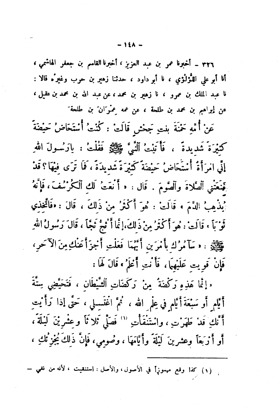 326 - أَخْبَرَنَا عُمَرُ بْنُ عَبْدِ الْعَزِيزِ، أَخْبَرَنَا الْقَاسِمُ بْنُ جَعْفَرٍ الْهَاشِمِيُّ، أَنا أَبُو عَلِيٍّ اللُّؤْلُئِيُّ، نَا أَبُو دَاوُدَ، حَدَّثَنَا زُهَيْرُ بْنُ حَرْبٍ، وَغَيْرُهُ، قَالا: نَا عَبْدُ الْمَلِكِ بْنُ عَمْرٍو، نَا زُهَيْرُ بْنُ مُحَمَّدٍ، عَنْ عَبْدِ اللَّهِ بْنِ مُحَمَّدِ بْنِ عُقَيْلٍ، عَنْ إِبْرَاهِيمَ بْنِ مُحَمَّدِ بْنِ طَلْحَةَ، عَنْ عَمِّهِ عِمْرَانَ بْنِ طَلْحَةَ، عَنْ أُمِّهِ حَمْنَةَ بِنْتِ جَحْشٍ، قَالَتْ: " كُنْتُ أُسْتَحَاضُ حَيْضَةً كَثِيرَةً شَدِيدَةً، فَأَتَيْتُ النَّبِيَّ صَلَّى اللهُ عَلَيْهِ وَسَلَّمَ، فَقُلْتُ: يَا رَسُولَ اللَّهِ، إِنِّي امْرَأَةٌ أُسْتَحَاضُ حَيْضَةً كَثِيرَةً شَدِيدَةً، فَمَا تَرَى فِيهَا؟ قَدْ مَنَعَتْنِي الصَّلاةَ وَالصَّوْمَ، قَالَ: «أَنْعَتُ لَكِ الْكُرْسُفَ، فَإِنَّهُ يُذْهِبُ الدَّمَ»، قَالَتْ: هُوَ أَكْثَرُ مِنْ ذَلِكَ، قَالَ: «فَاتَّخِذِي ثَوْبًا»، قَالَتْ: هُوَ أَكْثَرُ مِنْ ذَلِكَ، إِنَّمَا أَثُجُّ ثَجًّا، قَالَ رَسُولُ اللَّهِ صَلَّى اللهُ عَلَيْهِ وَسَلَّمَ: «سَآمُرُكِ بِأَمْرَيْنِ أَيَّهُمَا فَعَلْتِ أَجْزَأَ عَنْكِ مِنَ الآخَرِ، فَإِنْ قَوِيتِ عَلَيْهِمَا، فَأَنْتِ أَعْلَمُ»، قَالَ لَهَا: «إِنَّمَا هَذِهِ رَكْضَةٌ مِنْ رَكَضَاتِ الشَّيْطَانِ، فَتَحَيَّضِي سِتَّةَ أَيَّامٍ أَوْ سَبْعَةَ أَيَّامٍ فِي عِلْمِ اللَّهِ، ثُمَّ اغْتَسِلِي، حَتَّى إِذَا رَأَيْتِ أَنَّكِ قَدْ طَهُرْتِ، وَاسْتَنْقَأْتِ فَصَلِّي ثَلاثًا وَعِشْرِينَ لَيْلَةً، أَوْ أَرْبَعًا وَعِشْرِينَ لَيْلَةً وَأَيَّامَهَا، وَصُومِي، فَإِنَّ ذَلِكَ يُجْزِئُكِ،