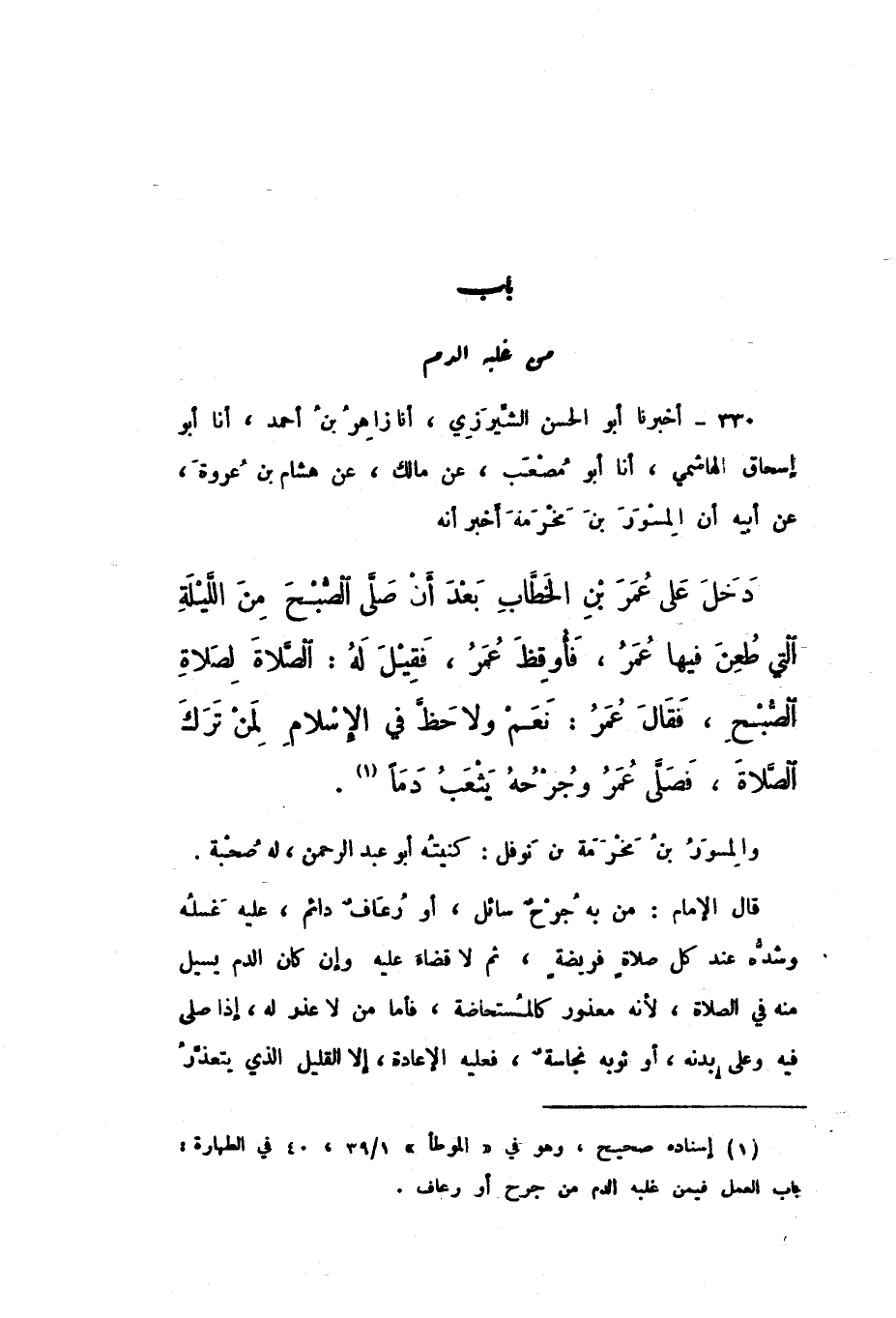 330 - أَخْبَرَنَا أَبُو الْحَسَنِ الشِّيرَزِيُّ، أَنا زَاهِرُ بْنُ أَحْمَدَ، أَنا أَبُو إِسْحَاقَ الْهَاشِمِيُّ، أَنا أَبُو مُصْعَبٍ، عَنْ مَالِكٍ، عَنْ هِشَامِ بْنِ عُرْوَةَ، عَنْ أَبِيهِ، أَنَّ الْمِسْوَرَ بْنَ مَخْرَمَةَ أَخْبَرَ، أَنَّهُ دَخَلَ عَلَى عُمَرَ بْنِ الْخَطَّابِ بَعْدَ أَنْ صَلَّى الصُّبْحَ مِنَ اللَّيْلَةِ الَّتِي طُعِنَ فِيهَا عُمَرُ، فَأُوقِظَ عُمَرُ، فَقِيلَ لَهُ: الصَّلاةَ.