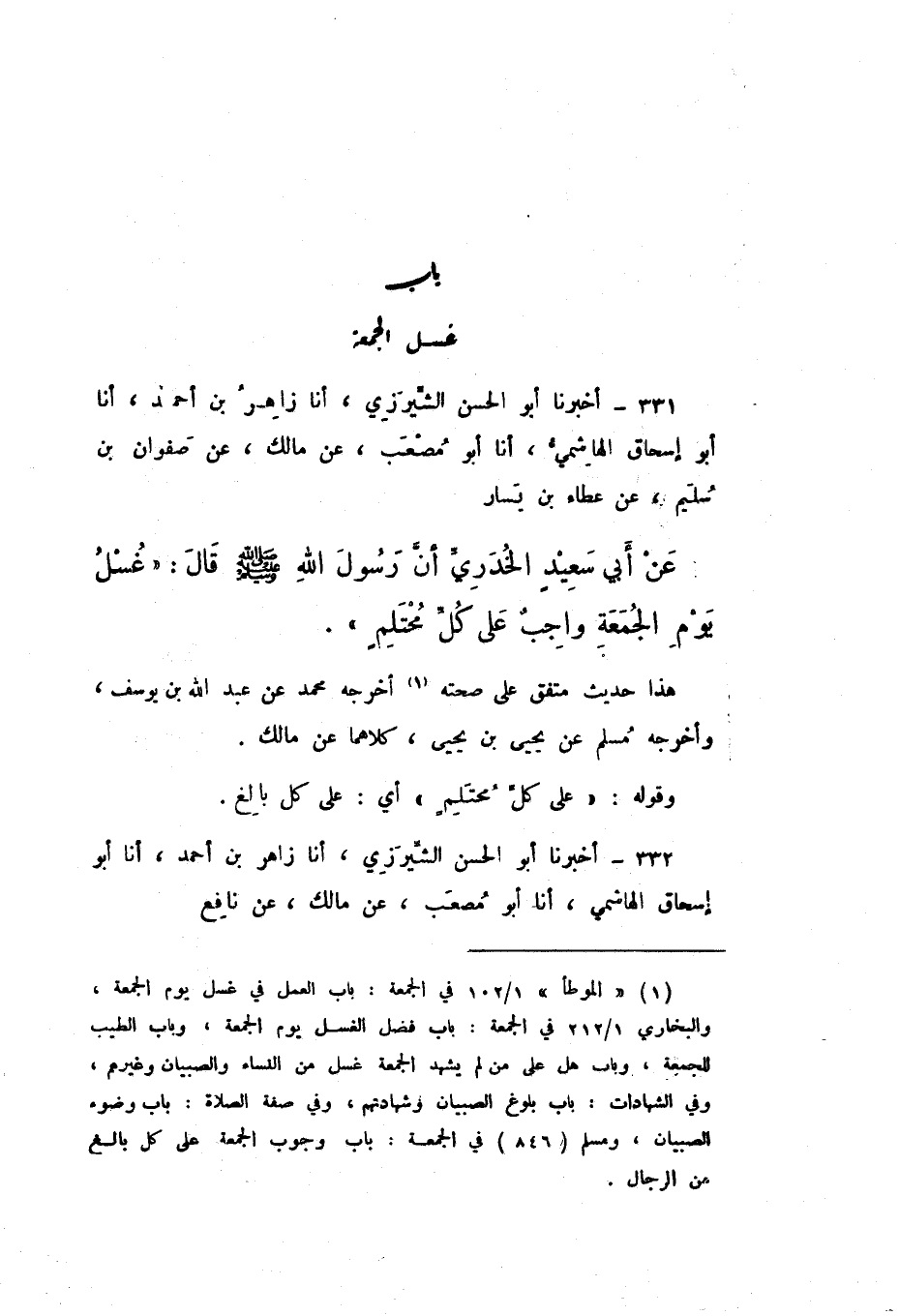 331 - أَخْبَرَنَا أَبُو الْحَسَنِ الشِّيرَزِيُّ، أَنا زَاهِرُ بْنُ أَحْمَدَ، أَنا أَبُو إِسْحَاقَ الْهَاشِمِيُّ، أَنا أَبُو مُصْعَبٍ، عَنْ مَالِكٍ، عَنْ صَفْوَانَ بْنِ سُلَيْمٍ، عَنْ عَطَاءِ بْنِ يَسَارٍ، عَنْ أَبِي سَعِيدٍ الْخُدْرِيِّ، أَنَّ رَسُولَ اللَّهِ صَلَّى اللهُ عَلَيْهِ وَسَلَّمَ، قَالَ: «غُسْلُ يَوْمِ الْجُمُعَةِ وَاجِبٌ عَلَى كُلِّ مُحْتَلِمٍ».