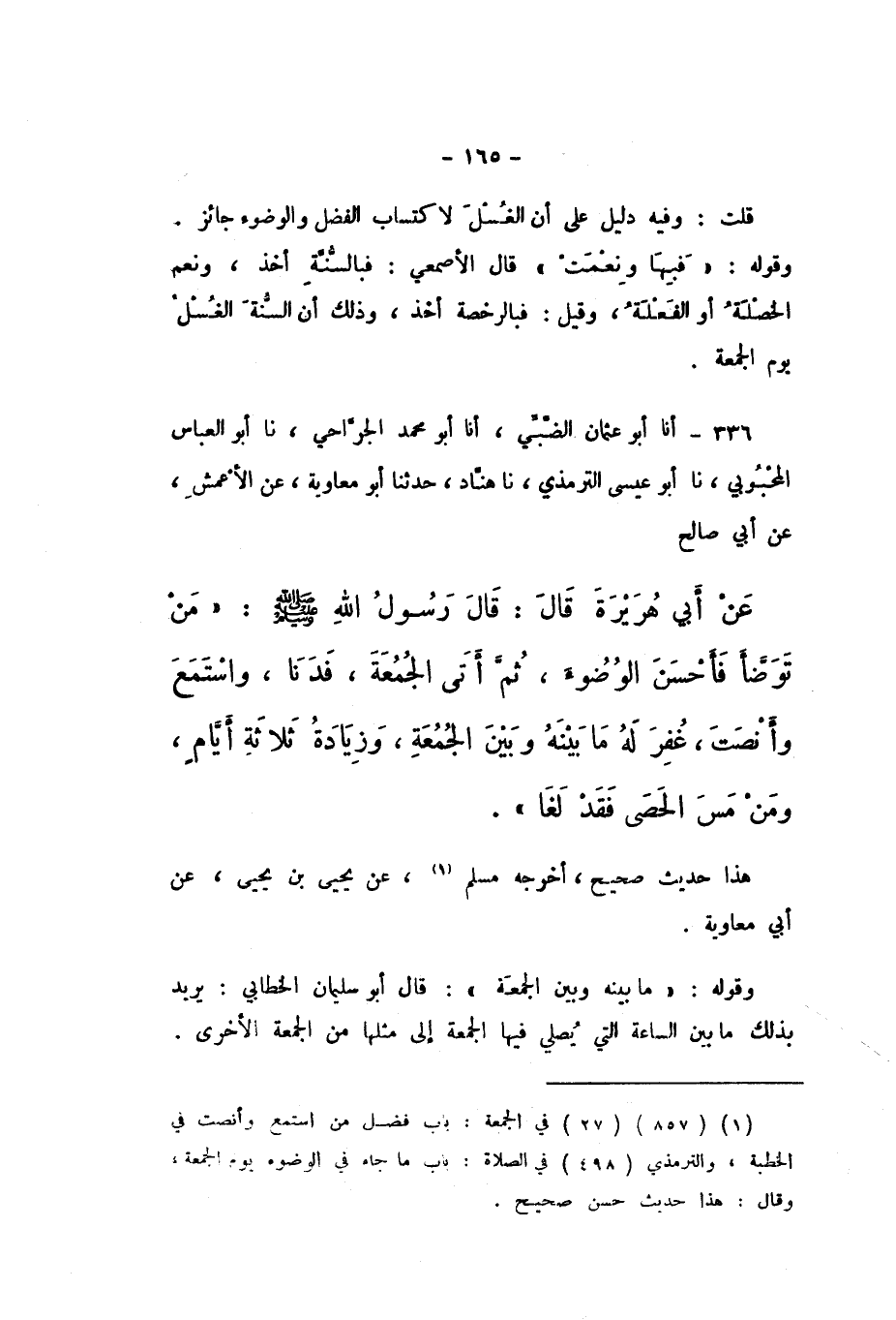 336 - أَنا أَبُو عُثْمَانَ الضَّبِّيُّ، أَنا أَبُو مُحَمَّدٍ الْجَرَّاحِيُّ، نَا أَبُو الْعَبَّاسِ الْمَحْبُوبِيُّ، نَا أَبُو عِيسَى التِّرْمِذِيُّ، نَا هَنَّادٌ، حَدَّثَنَا أَبُو مُعَاوِيَةَ، عَنِ الأَعْمَشِ، عَنْ أَبِي صَالِحٍ، عَنْ أَبِي هُرَيْرَةَ، قَالَ: قَالَ رَسُولُ اللَّهِ صَلَّى اللهُ عَلَيْهِ وَسَلَّمَ: «مَنْ تَوَضَّأَ فَأَحْسَنَ الْوُضُوءَ، ثُمَّ أَتَى الْجُمُعَةَ، فَدَنَا، وَاسْتَمَعَ وَأَنْصَتَ، غُفِرَ لَهُ مَا بَيْنَهُ وَبَيْنَ الْجُمُعَةِ، وَزِيَادَةُ ثَلاثَةِ أَيَّامٍ، وَمَنْ مَسَّ الْحَصَى فَقَدْ لَغَا».