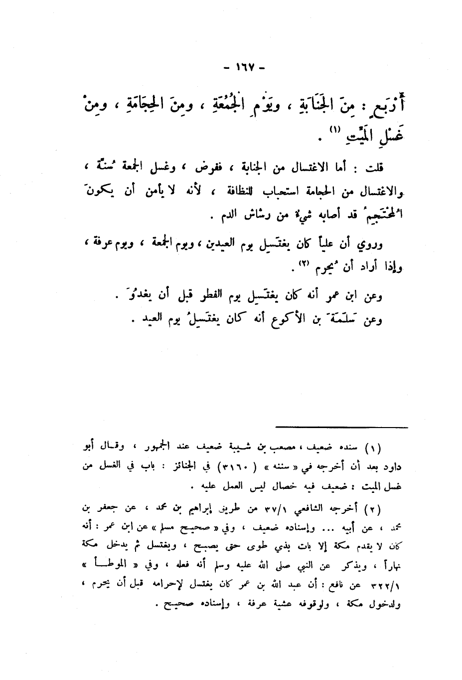 وَرُوِيَ أَنَّ عَلِيًّا كَانَ «يَغْتَسِلُ يَوْمَ الْعِيدَيْنِ، وَيَوْمَ الْجُمُعَةِ، وَيَوْمَ عَرَفَةَ، وَإِذَا أَرَادَ أَنْ يُحْرِمَ».