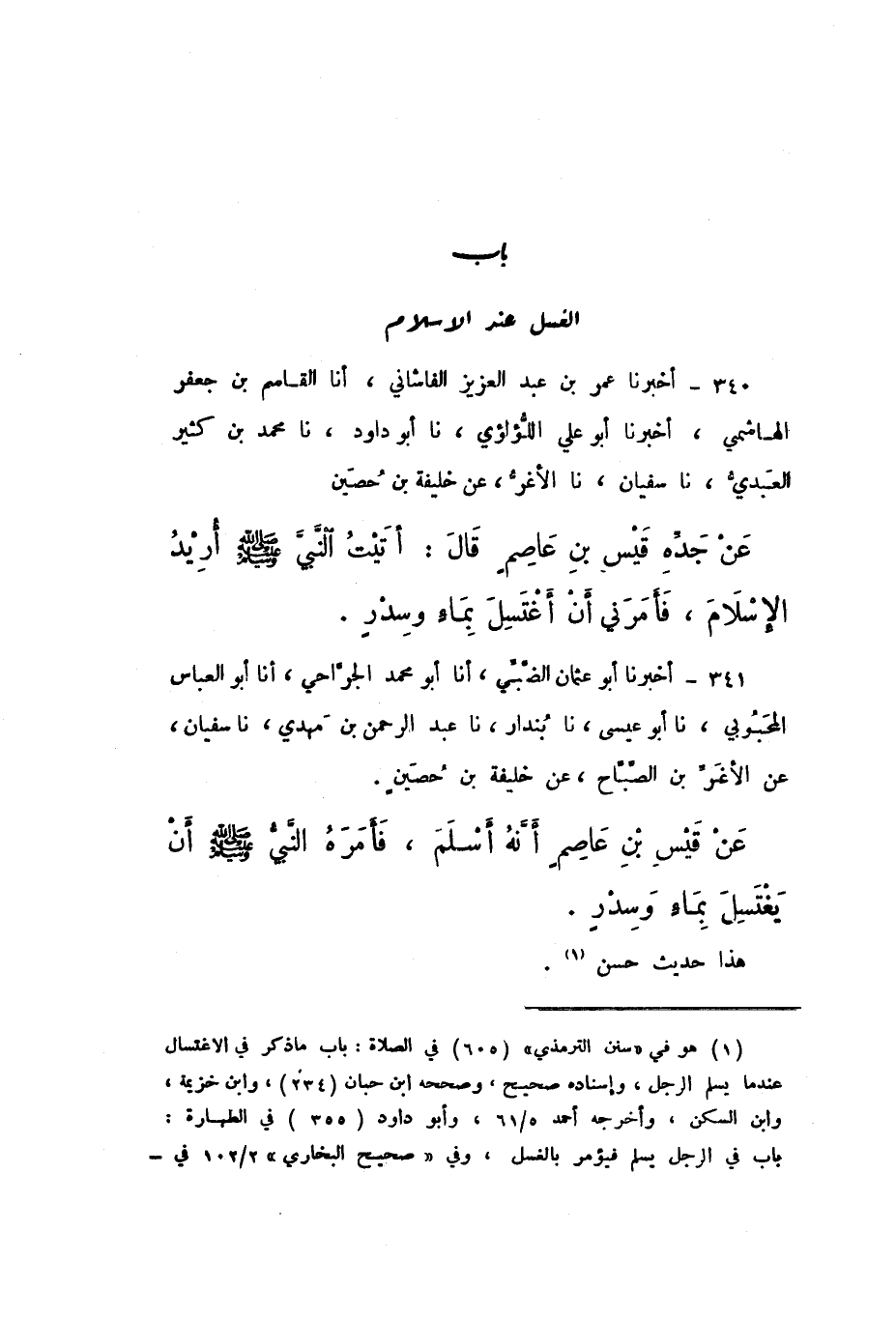 341 - أَخْبَرَنَا أَبُو عُثْمَانَ الضَّبِّيُّ، أَنا مُحَمَّدٌ الْجَرَّاحِيُّ، أَنا أَبُو الْعَبَّاسِ الْمَحْبُوبِيُّ، نَا أَبُو عِيسَى، نَا بُنْدَارٌ، نَا عَبْدُ الرَّحْمَنِ بْنُ مَهْدِيٍّ، نَا سُفْيَانُ، عَنِ الأَغَرِّ بْنِ الصَّبَّاحِ، عَنْ خَلِيفَةَ بْنِ حُصَيْنٍ، عَنْ قَيْسِ بْنِ عَاصِمٍ: أَنَّهُ أَسْلَمَ، «فَأَمَرَهُ النَّبِيُّ صَلَّى اللهُ عَلَيْهِ وَسَلَّمَ أَنْ يَغْتَسِلَ بِمَاءٍ وَسِدْرٍ».
