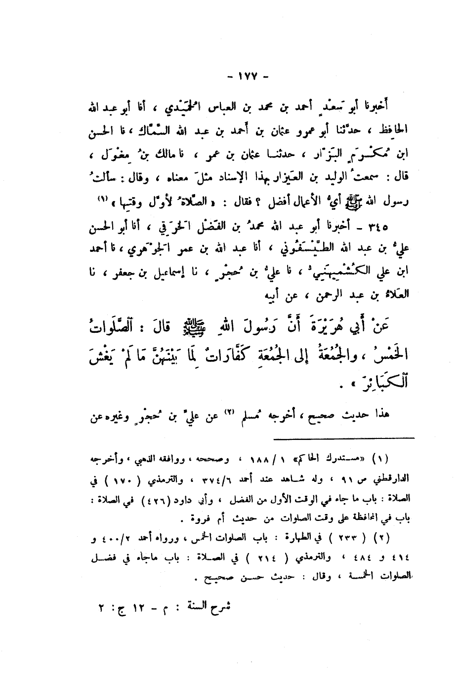 أَخْبَرَنَا أَبُو سَعْدٍ أَحْمَدُ بْنُ مُحَمَّدِ بْنِ الْعَبَّاسِ الْحُمَيْدِيُّ، أَنَا أَبُو عَبْدِ اللَّهِ الْحَافِظُ، حَدَّثَنَا أَبُو عَمْرٍو عُثْمَانُ بْنُ أَحْمَدَ بْنِ عَبْدِ اللَّهِ السَّمَّاكُ، نَا الْحَسَنُ بْنُ مُكْرَمٍ الْبَزَّارُ، حَدَّثَنَا عُثْمَانُ بْنُ عُمَرَ، نَا مَالِكُ بْنُ مِغْوَلٍ، قَالَ: سَمِعْتُ الْوَلِيدَ بْنَ الْعِيزَارِ، بِهَذَا الإِسْنَادِ مِثْلَ مَعْنَاهُ، وَقَالَ: سَأَلْتُ رَسُولَ اللَّهِ صَلَّى اللهُ عَلَيْهِ وَسَلَّمَ: أَيُّ الأَعْمَالِ أَفْضَلُ؟ فَقَالَ: «الصَّلاةُ لأَوَّلِ وَقْتِهَا»