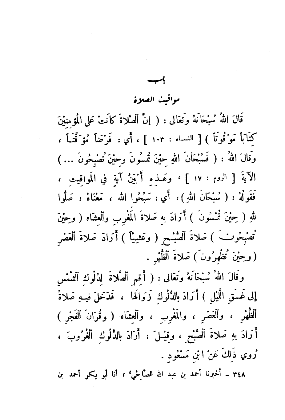 قَالَ اللَّهُ سُبْحَانَهُ وَتَعَالَى: {إِنَّ الصَّلاةَ كَانَتْ عَلَى الْمُؤْمِنِينَ كِتَابًا مَوْقُوتًا} [النِّسَاء: 103] أَيْ: فَرْضًا مُؤَقَّتًا، وَقَالَ اللَّهُ: {فَسُبْحَانَ اللَّهِ حِينَ تُمْسُونَ وَحِينَ تُصْبِحُونَ} [الرّوم: 17] وَهَذِهِ أَبْيَنُ آيَةٍ فِي الْمَوَاقِيتِ، فَقَوْلُهُ: {فَسُبْحَانَ اللَّهِ} [الرّوم: 17]، أَيْ: سَبِّحُوا اللَّهَ، مَعْنَاهُ: صَلُّوا لِلَّهِ {حِينَ تُمْسُونَ} [الرّوم: 17] أَرَادَ بِهِ صَلاةَ الْمَغْرِبِ وَالْعِشَاءِ، {وَحِينَ تُصْبِحُونَ} [الرّوم: 17] صَلاةَ الصُّبْحِ، {وَعَشِيًّا} [الرّوم: 18] أَرَادَ صَلاةَ الْعَصْرِ، {وَحِينَ تُظْهِرُونَ} [الرّوم: 18] صَلاةَ الظُّهْرِ.