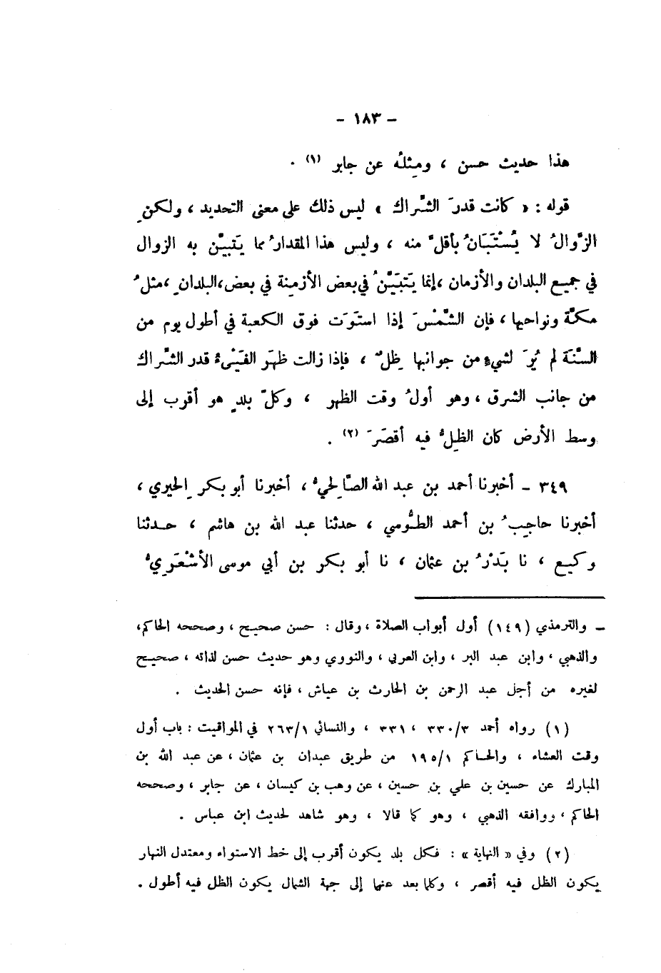 قَوْلُهُ: «كَانَتْ قَدْرَ الشِّرَاكِ» لَيْسَ ذَلِكَ عَلَى مَعْنَى التَّحْدِيدِ، وَلَكِنِ الزَّوَالَ لَا يُسْتَبَانُ بِأَقَلَّ مِنْهُ، وَلَيْسَ هَذَا الْمِقْدَارُ مِمَّا يَتَبَيَّنُ بِهِ الزَّوَالُ فِي جَمِيعِ الْبِلْدَانِ وَالأَزْمَانِ، إِنَّمَا يَتَبَيَّنُ فِي بَعْضِ الأَزْمِنَةِ فِي بَعْضِ الْبِلْدَانِ، مِثْلُ مَكَّةَ وَنَوَاحِيهَا، فَإِنَّ الشَّمْسَ إِذَا اسْتَوَتْ فَوْقَ الْكَعْبَةِ فِي أَطْوَلَ يَوْمٍ مِنَ السَّنَةِ، لَمْ يُرَ لِشَيْءٍ مِنْ جَوَانِبِهَا ظِلٌّ، فَإِذَا زَالَتْ، ظَهَرَ الْفَيْءُ قَدْرَ الشِّرَاكِ مِنْ جَانِبِ الشَّرْقِ، وَهُوَ أَوَّلُ وَقْتِ الظُّهْرِ، وَكُلُّ بَلَدٍ هُوَ أَقْرَبُ إِلَى وَسَطِ الأَرْضِ، كَانَ الظِّلُّ فِيهِ أَقْصَرَ
