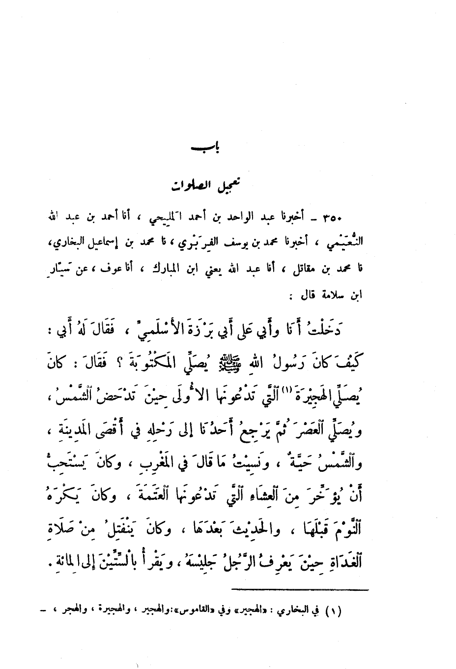 350 - أَخْبَرَنَا عَبْدُ الْوَاحِدِ بْنُ أَحْمَدَ الْمَلِيحِيُّ، أَنَا أَحْمَدُ بْنُ عَبْدِ اللَّهِ النُّعَيْمِيُّ، أَخْبَرَنَا مُحَمَّدُ بْنُ يُوسُفَ الْفَرَبْرِيُّ، نَا مُحَمَّدُ بْنُ إِسْمَاعِيلَ الْبُخَارِيُّ، نَا مُحَمَّدُ بْنُ مُقَاتِلٍ، أَنَا عَبْدُ اللَّهِ يَعْنِي ابْنَ الْمُبَارَكِ، أَنَا عَوْفٌ، عَنْ سَيَّارِ بْنِ سَلامَةَ، قَالَ: دَخَلْتُ أَنَا، وَأَبِي عَلَى أَبِي بَرْزَةَ الأَسْلَمِيِّ، فَقَالَ لَهُ أَبِي: كَيْفَ كَانَ رَسُولُ اللَّهِ صَلَّى اللهُ عَلَيْهِ وَسَلَّمَ يُصَلِّي الْمَكْتُوبَةَ؟ فَقَالَ: «كَانَ يُصَلِّي الْهَجِيرَةَ الَّتِي تَدْعُونَهَا الأُولَى حِينَ تَدْحَضُ الشَّمْسُ، وَيُصَلِّي الْعَصْرَ، ثُمَّ يَرْجِعُ أَحَدُنَا إِلَى رَحْلِهِ فِي أَقْصَى الْمَدِينَةِ، وَالشَّمْسُ حَيَّةٌ، وَنَسِيتُ مَا قَالَ فِي الْمَغْرِبِ، وَكَانَ يَسْتَحِبُّ أَنْ يُؤَخِّرَ مِنَ الْعِشَاءِ الَّتِي تَدْعُونَهَا الْعَتَمَةَ، وَكَانَ يَكْرَهُ النَّوْمَ قَبْلَهَا، وَالْحَدِيثَ بَعْدَهَا، وَكَانَ يَنْفَتِلُ مِنْ صَلاةِ الْغَدَاةِ حِينَ يَعْرِفُ الرَّجُلُ جَلِيسَهُ، وَيَقْرَأُ بِالسِّتِّينَ إِلَى الْمِائَةِ».