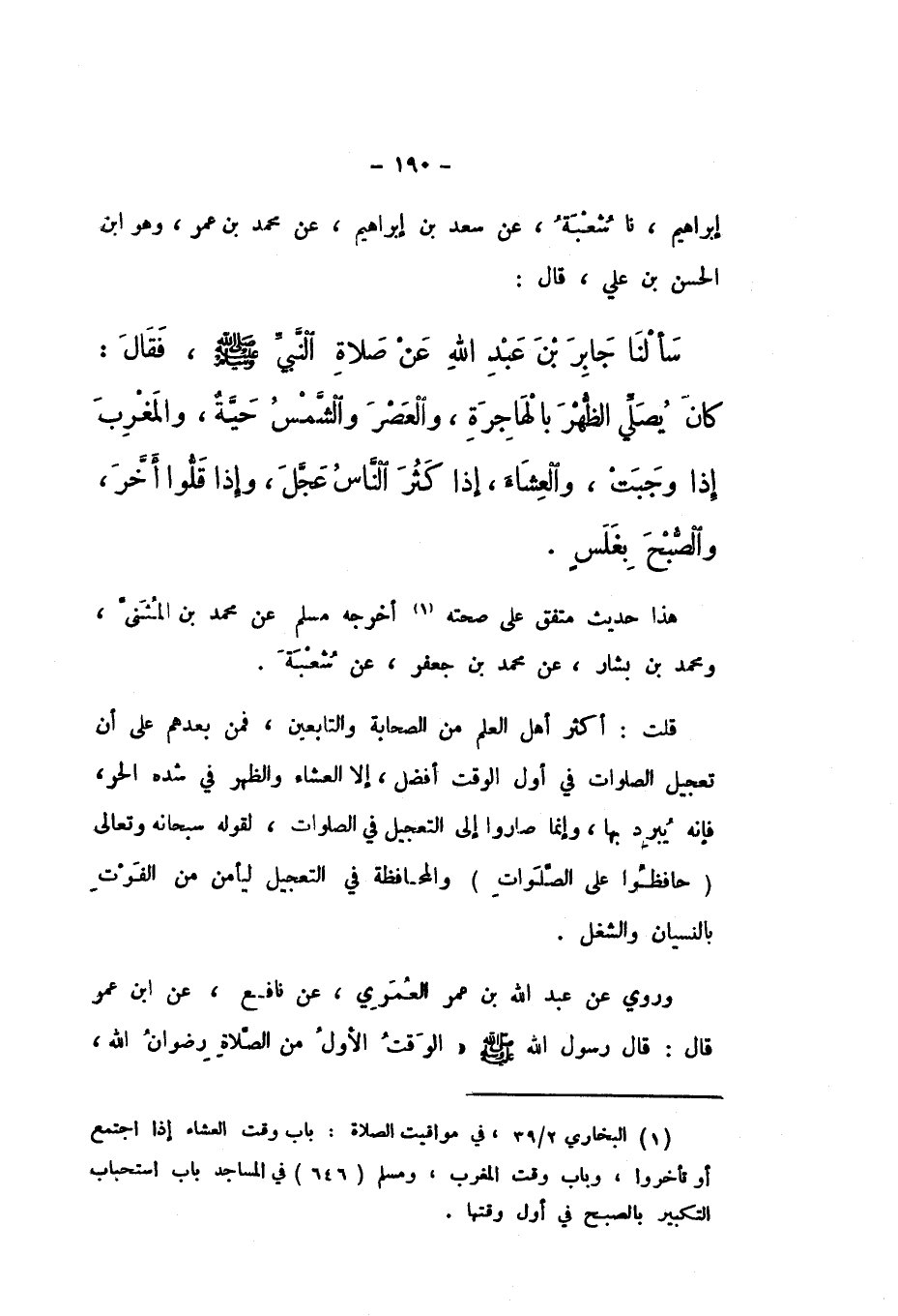 قُلْتُ: أَكْثَرُ أَهْلِ الْعِلْمِ مِنَ الصَّحَابَةِ، وَالتَّابِعِينَ، فَمَنْ بَعْدَهُمْ، عَلَى «أَنَّ تَعْجِيلَ الصَّلَوَاتِ فِي أَوَّلِ الْوَقْتِ أَفْضَلُ، إِلا الْعِشَاءَ، وَالظُّهْرَ فِي شِدَّةِ الْحَرِّ، فَإِنَّهُ يُبَرِّدُ بِهَا»، وَإِنَّمَا صَارُوا إِلَى التَّعْجِيلِ فِي الصَّلَوَاتِ، لِقَوْلِهِ سُبْحَانَهُ وَتَعَالَى: {حَافِظُوا عَلَى الصَّلَوَاتِ} [الْبَقَرَة: 238] وَالْمُحَافَظَةُ فِي التَّعْجِيلِ لِيَأْمَنَ مِنَ الْفَوْتِ بِالنِّسْيَانِ وَالشُّغْلِ.
