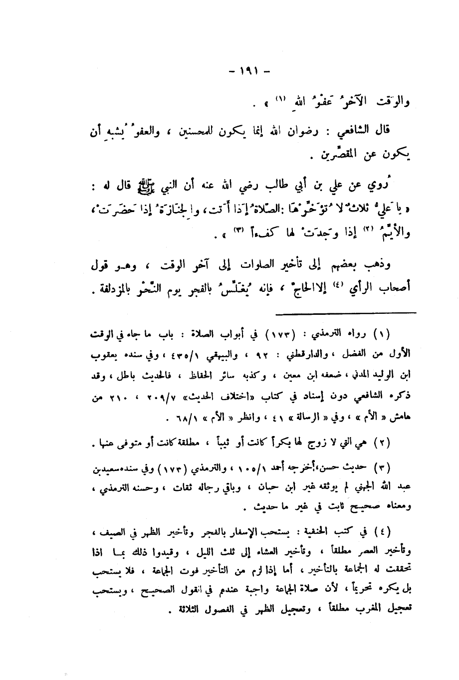 رُوِيَ عَنْ عَلِيِّ بْنِ أَبِي طَالِبٍ رَضِيَ اللَّهُ عَنْهُ، أَنَّ النَّبِيَّ صَلَّى اللهُ عَلَيْهِ وَسَلَّمَ، قَالَ لَهُ: " يَا عَلِيُّ، ثَلاثٌ لَا تُؤَخِّرْهَا: الصَّلاةُ إِذَا أَتَتْ، وَالْجِنَازَةُ إِذَا حَضَرَتْ، وَالأَيِّمُ إِذَا وَجَدَتْ لَهَا كُفْئًا " وَذَهَبَ بَعْضُهُمْ إِلَى تَأْخِيرِ الصَّلَوَاتِ إِلَى آخِرِ الْوَقْتِ، وَهُوَ قَوْلُ أَصْحَابِ الرَّأْيِ إِلا الْحَاجَّ، فَإِنَّهُ يُغَلِّسُ يَوْمَ النَّحْرِ بِالْمُزْدَلِفَةِ.