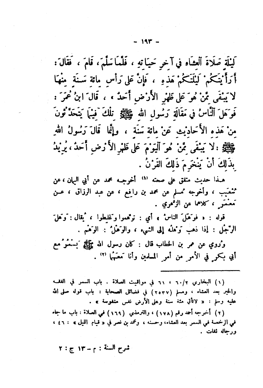 لَيْلَةٍ صَلاةَ الْعِشَاءِ فِي آَخِرِ حَيَاتِهِ، فَلَمَّا سَلَّمَ، قَامَ، فَقَالَ: «أَرَأَيْتُكُمْ لَيْلَتَكُمْ هَذِهِ، فَإِنَّ عَلَى رَأْسِ مِائَةِ سَنَةٍ مِنْهَا لَا يَبْقَى مِمَّنْ هُوَ عَلَى ظَهْرِ الأَرْضِ أَحَدٌ»، قَالَ ابْنُ عُمَرَ: فَوَهَلَ النَّاسُ فِي مَقَالَةِ رَسُولِ اللَّهِ صَلَّى اللهُ عَلَيْهِ وَسَلَّمَ تِلْكَ فِيمَا يَتَحَدَّثُونَ مِنْ هَذِهِ الأَحَادِيثِ عَنْ مِائَةِ سَنَةٍ، وَإِنَّمَا قَالَ رَسُولُ اللَّهِ صَلَّى اللهُ عَلَيْهِ وَسَلَّمَ: «لَا يَبْقَى مِمَّنْ هُوَ الْيَوْمَ عَلَى ظَهْرِ الأَرْضِ أَحَدٌ»، يُرِيدُ بِذَلِكَ أَنْ يَنْخَرِمَ ذَلِكَ الْقَرْنُ.