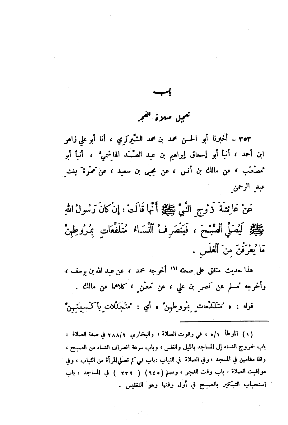 353 - أَخْبَرَنَا أَبُو الْحَسَنِ مُحَمَّدُ بْنُ مُحَمَّدٍ الشِّيرَزِيُّ، أَنَا أَبُو عَلِيٍّ زَاهِرُ بْنُ أَحْمَدَ، أَخْبَرَنَا أَبُو إِسْحَاقَ إِبْرَاهِيمُ بْنُ عَبْدِ الصَّمَدِ الْهَاشِمِيُّ، أَنْبَأَ أَبُو مُصْعَبٍ، عَنْ مَالِكِ بْنِ أَنَسٍ، عَنْ يَحْيَى بْنِ سَعِيدٍ، عَنْ عَمْرَةَ بِنْتِ عَبْدِ الرَّحْمَنِ، عَنْ عَائِشَةَ زَوْجِ النَّبِيِّ صَلَّى اللهُ عَلَيْهِ وَسَلَّمَ، أَنَّهَا قَالَتْ: «إِنْ كَانَ رَسُولُ اللَّهِ صَلَّى اللهُ عَلَيْهِ وَسَلَّمَ لَيُصَلِّي الصُّبْحَ، فَيَنْصَرِفُ النِّسَاءُ مُتَلَفِّعَاتٍ بِمُرُوطِهِنَّ، مَا يُعْرَفْنَ مِنَ الْغَلَسِ».