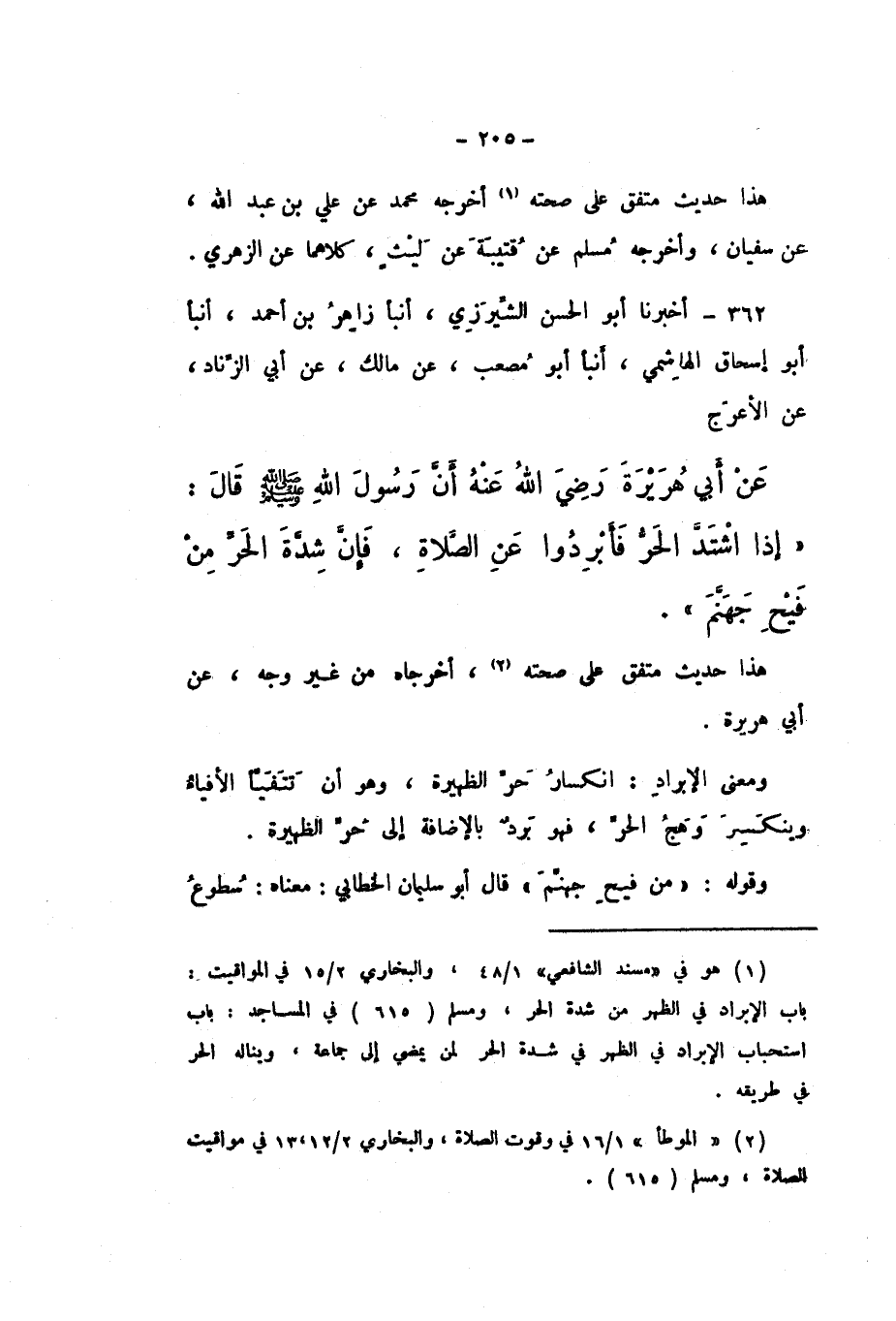 362 - أَخْبَرَنَا أَبُو الْحَسَنِ الشِّيرَزِيُّ، أَنْبَأَ زَاهِرُ بْنُ أَحْمَدَ، أَنْبَأَ أَبُو إِسْحَاقَ الْهَاشِمِيُّ، أَنْبَأَ أَبُو مُصْعَبٍ، عَنْ مَالِكٍ، عَنْ أَبِي الزِّنَادِ، عَنِ الأَعْرَجِ، عَنْ أَبِي هُرَيْرَةَ، رَضِيَ اللَّهُ عَنْهُ، أَنَّ رَسُولَ اللَّهِ صَلَّى اللهُ عَلَيْهِ وَسَلَّمَ، قَالَ: «إِذَا اشْتَدَّ الْحَرُّ، فَأَبْرِدُوا عَنِ الصَّلاةِ، فَإِنَّ شِدَّةَ الْحَرِّ مِنْ فَيْحِ جَهَنَّمَ».