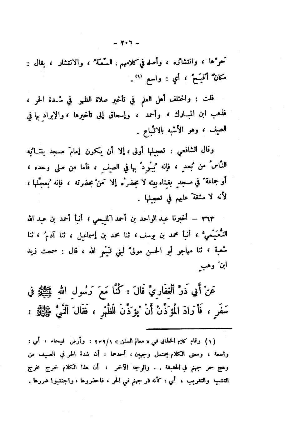 363 - أَخْبَرَنَا عَبْدُ الْوَاحِدِ بْنُ أَحْمَدَ الْمَلِيحِيُّ، أَنْبَأَ أَحْمَدُ بْنُ عَبْدِ اللَّهِ النُّعَيْمِيُّ، أَنْبَأَ مُحَمَّدُ بْنُ يُوسُفَ، ثَنَا مُحَمَّدُ بْنُ إِسْمَاعِيلَ، ثَنَا آدَمُ، ثَنَا شُعْبَةُ، ثَنَا مُهَاجِرٌ أَبُو الْحَسَنِ مَوْلًى لِبَنِي تَيْمِ اللَّهِ، قَالَ: سَمِعْتُ زَيْدَ بْنَ وَهْبٍ، عَنْ أَبِي ذَرٍّ الْغِفَارِيِّ، قَالَ: كُنَّا مَعَ رَسُولِ اللَّهِ صَلَّى اللهُ عَلَيْهِ وَسَلَّمَ فِي سَفَرٍ، فَأَرَادَ الْمُؤَذِّنُ أَنْ يُؤَذِّنَ لِلظُّهْرِ، فَقَالَ النَّبِيُّ صَلَّى اللهُ عَلَيْهِ وَسَلَّمَ: «