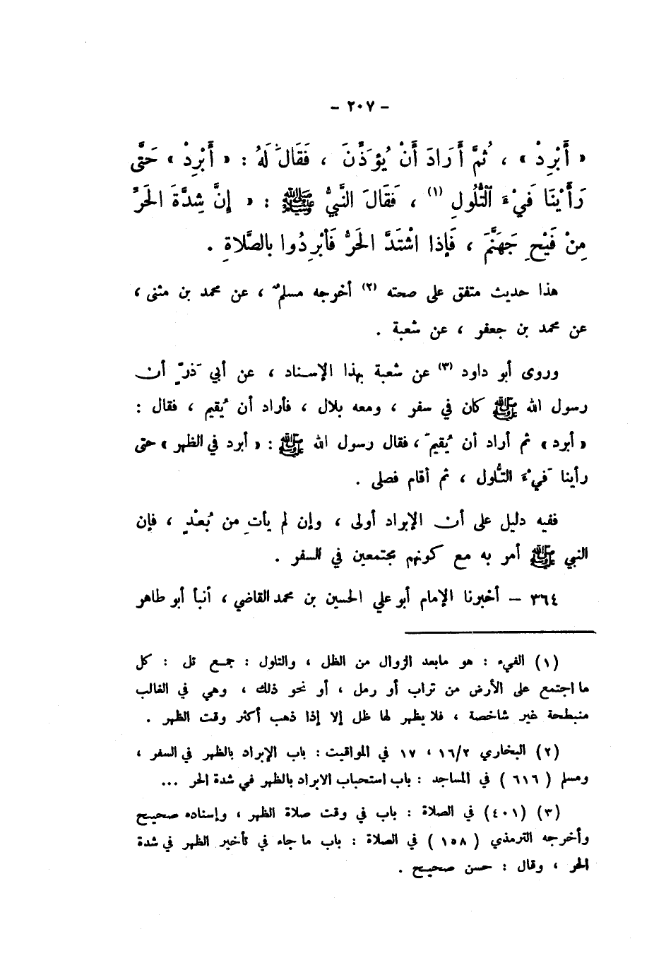 أَبْرِدْ»، ثُمَّ أَرَادَ أَنْ يُؤَذِّنَ، فَقَالَ لَهُ: «أَبْرِدْ»، حَتَّى رَأَيْنَا فَيْءَ التُّلُولِ، فَقَالَ النَّبِيُّ صَلَّى اللهُ عَلَيْهِ وَسَلَّمَ: «إِنَّ شِدَّةَ الْحَرِّ مِنْ فَيْحِ جَهَنَّمَ، فَإِذَا اشْتَدَّ الْحَرُّ، فَأَبْرِدُوا بِالصَّلاةِ».