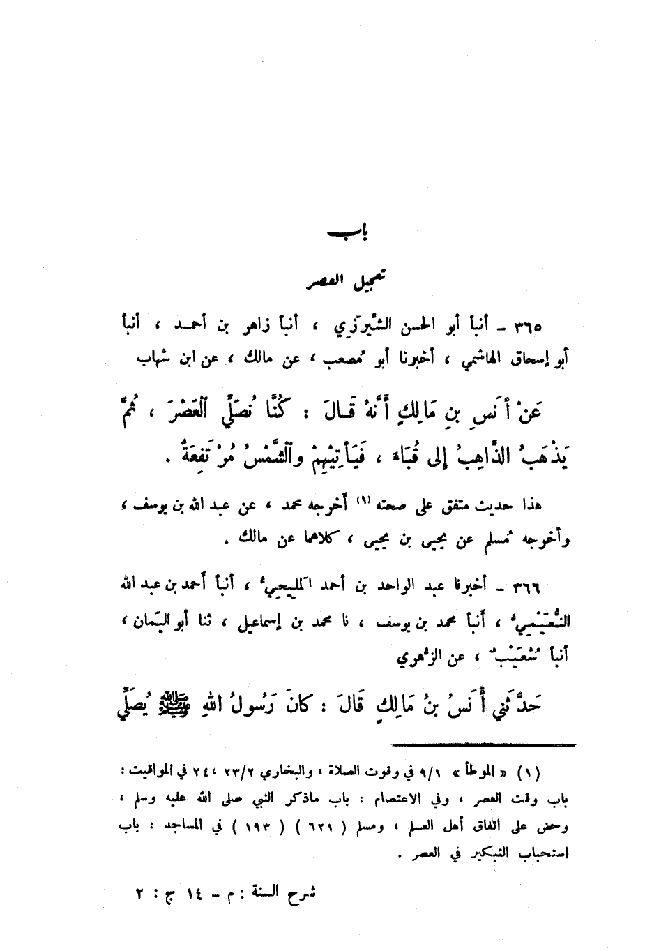 365 - أَنْبَأَ أَبُو الْحَسَنِ الشِّيرَزِيُّ، أَنْبَأَ زَاهِرُ بْنُ أَحْمَدَ، أَنْبَأَ أَبُو إِسْحَاقَ الْهَاشِمِيُّ، أَخْبَرَنَا أَبُو مُصْعَبٍ، عَنْ مَالِكٍ، عَنِ ابْنِ شِهَابٍ، عَنْ أَنَسِ بْنِ مَالِكٍ، أَنَّهُ قَالَ: «كُنَّا نُصَلِّي الْعَصْرَ، ثُمَّ يَذْهَبُ الذَّاهِبُ إِلَى قُبَاءَ، فَيَأْتِيهِمْ وَالشَّمْسُ مُرْتَفِعَةٌ».