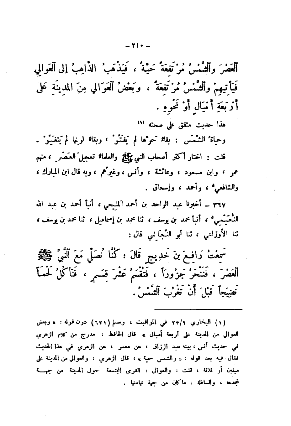 الْعَصْرَ وَالشَّمْسُ مُرْتَفِعَةٌ حَيَّةٌ، فَيَذْهَبُ الذَّاهِبُ إِلَى الْعَوَالِي، فَيَأْتِيهِمْ وَالشَّمْسُ مُرْتَفِعَةٌ، وَبَعْضُ الْعَوَالِي مِنَ الْمَدِينَةِ عَلَى أَرْبَعَةِ أَمْيَالٍ أَوْ نَحْوِهِ».