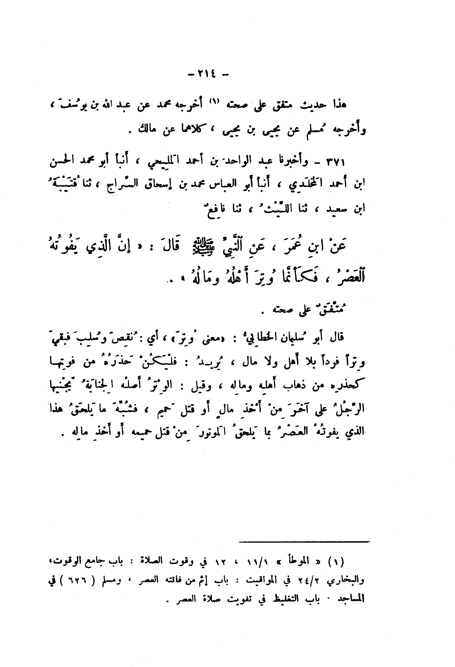 371 - وَأَخْبَرَنَا عَبْدُ الْوَاحِدِ بْنُ أَحْمَدَ الْمَلِيحِيُّ، أَنْبَأَ أَبُو مُحَمَّدٍ الْحَسَنُ بْنُ أَحْمَدَ الْمَخْلَدِيُّ، أَنْبَأَ أَبُو الْعَبَّاسِ مُحَمَّدُ بْنُ إِسْحَاقَ السَّرَّاجُ، ثَنَا قُتَيْبَةُ بْنُ سَعِيدٍ، ثَنَا اللَّيْثُ، ثَنَا نَافِعٌ، عَنِ ابْنِ عُمَرَ، عَنِ النَّبِيِّ صَلَّى اللهُ عَلَيْهِ وَسَلَّمَ، قَالَ: «إِنَّ الَّذِي يَفُوتُهُ الْعَصْرُ، فَكَأَنَّمَا وُتِرَ أَهْلُهُ وَمَالُهُ».