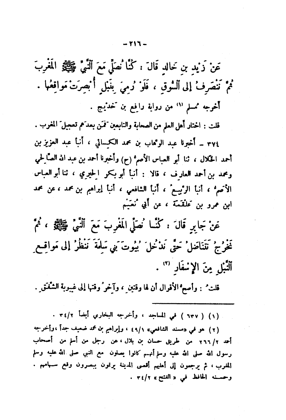 أَخْرَجَهُ مُسْلِمٌ مِنْ رِوَايَةِ رَافِعِ بْنِ خَدِيجٍ، قُلْتُ: اخْتَارَ أَهْلُ الْعِلْمِ مِنَ الصَّحَابَةِ، وَالتَّابِعِينَ، فَمَنْ بَعْدَهُمْ تَعْجِيلَ الْمَغْرِبِ