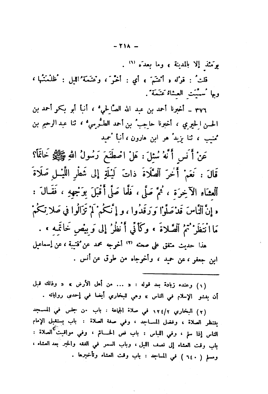 376 - أَخْبَرَنَا أَحْمَدُ بْنُ عَبْدِ اللَّهِ الصَّالِحِيُّ، أَنْبَأَ أَبُو بَكْرٍ أَحْمَدُ بْنُ الْحَسَنِ الْحِيرِيُّ، أَخْبَرَنَا حَاجِبُ بْنُ أَحْمَدَ الطُّوسِيُّ، ثَنَا عَبْدُ الرَّحِيمِ بْنُ مُنِيب، ثَنَا يَزِيدُ هُوَ ابْنُ هَارُونَ، أَنْبَأَ حُمَيْدٍ، عَنْ أَنَسٍ، أَنَّهُ سُئِلَ: هَلِ اصْطَنَعَ رَسُولُ اللَّهِ صَلَّى اللهُ عَلَيْهِ وَسَلَّمَ خَاتَمًا؟ قَالَ: نَعَمْ، أَخَّرَ الصَّلاةَ ذَاتَ لَيْلَةٍ إِلَى شَطْرِ اللَّيْلِ، صَلاةَ الْعِشَاءِ الْآخِرَةِ، ثُمَّ صَلَّى، فَلَمَّا صَلَّى أَقْبَلَ بِوَجْهِهِ، فَقَالَ: «إِنَّ النَّاسَ قَدْ صَلُّوا وَرَقَدُوا، وَإِنَّكُمْ لَمْ تَزَالُوا فِي صَلاةٍ مَا انْتَظَرْتُمُ الصَّلاةَ»، وَكَأَنِّي أَنْظُرُ إِلَى وَبِيصِ خَاتَمِهِ.