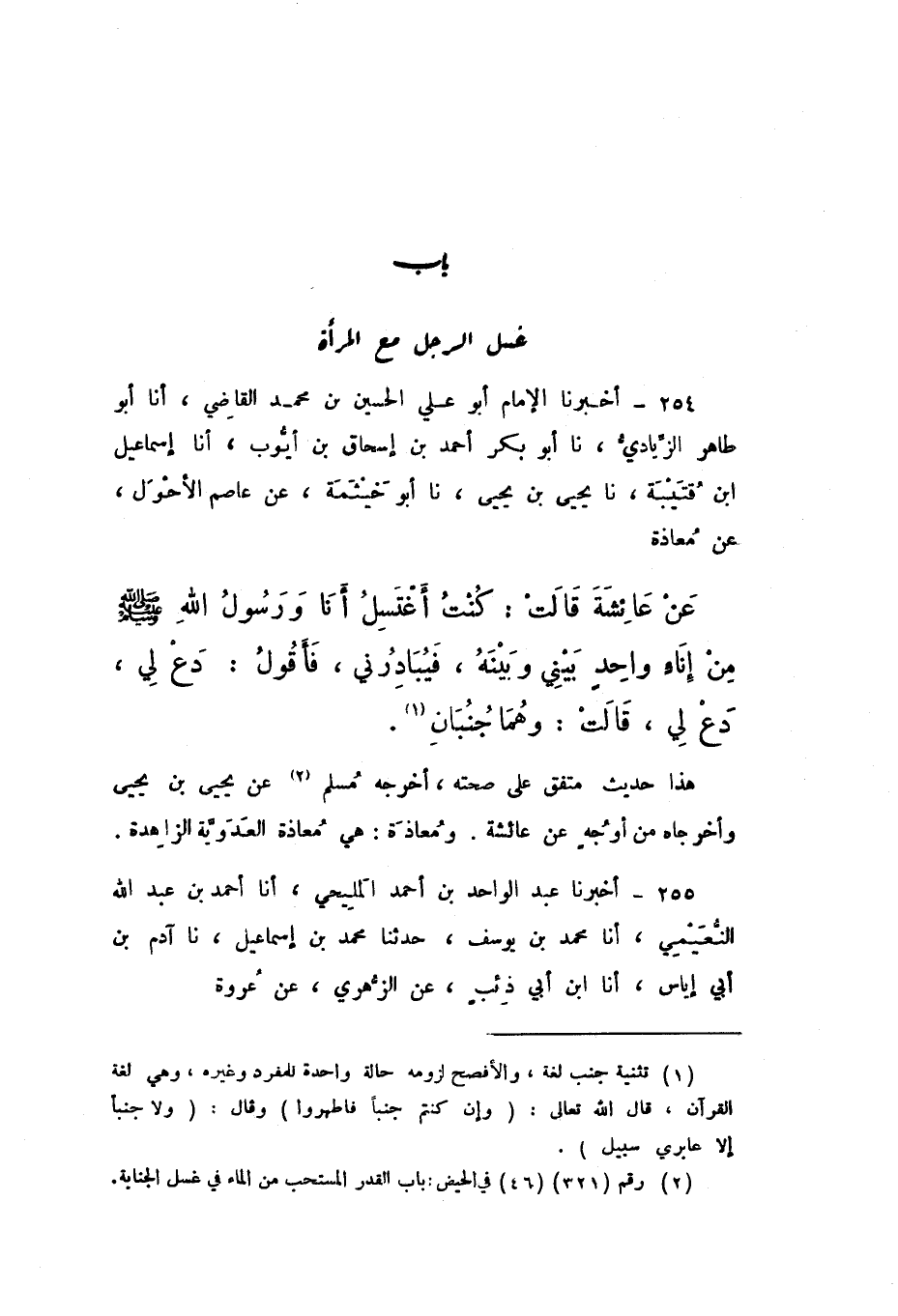 254 - أَخْبَرَنَا الإِمَامُ أَبُو عَلِيٍّ الْحُسَيْنُ بْنُ مُحَمَّدٍ الْقَاضِي، أَنا أَبُو طَاهِرٍ الزِّيَادِيُّ، نَا أَبُو بَكْرٍ أَحْمَدُ بْنُ إِسْحَاقَ بْنِ أَيُّوبَ، أَنا إِسْمَاعِيلُ بْنُ قُتَيْبَةَ، نَا يَحْيَى بْنُ يَحْيَى، نَا أَبُو خَيْثَمَةَ، عَنْ عَاصِمٍ الأَحْوَلِ، عَنْ مُعَاذَةَ، عَنْ عَائِشَةَ، قَالَتْ: " كُنْتُ أَغْتَسِلُ أَنَا وَرَسُولُ اللَّهِ صَلَّى اللهُ عَلَيْهِ وَسَلَّمَ مِنْ إِنَاءٍ وَاحِدٍ بَيْنِي وَبَيْنَهُ، فَيُبَادِرُنِي، فَأَقُولُ: دَعْ لِي، دَعْ لِي، قَالَتْ: وَهُمَا جُنُبَانِ ".