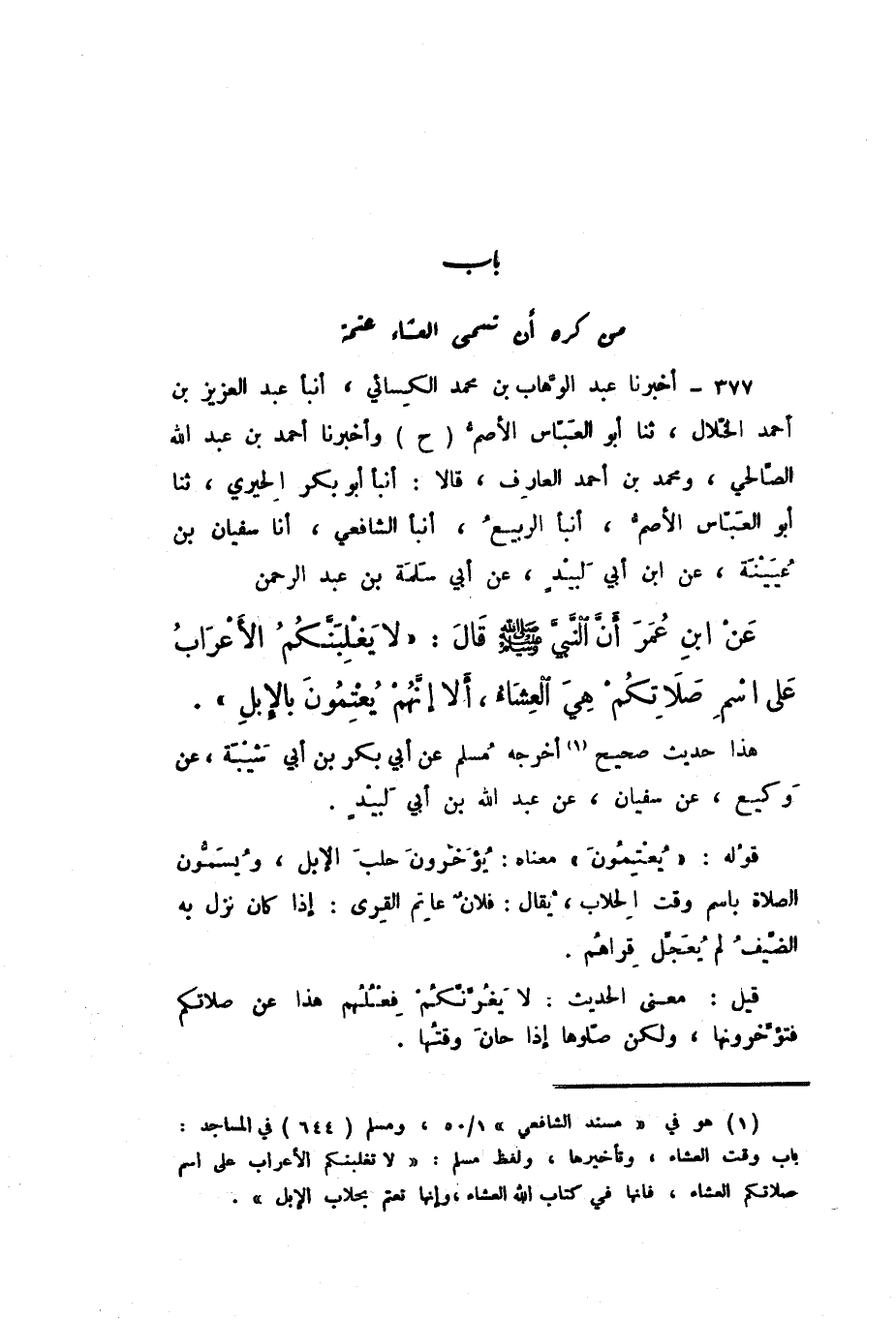 ح وَأَخْبَرَنَا أَحْمَدُ بْنُ عَبْدِ اللَّهِ الصَّالِحِيُّ، وَمُحَمَّدُ بْنُ أَحْمَدَ الْعَارِفُ، قَالا: أَنْبَأَ أَبُو بَكْرٍ الْحِيرِيُّ، ثَنَا أَبُو الْعَبَّاسِ الأَصَمُّ، أَنْبَأَ الرَّبِيعُ، أَنْبَأَ الشَّافِعِيُّ، أَنَا سُفْيَانُ بْنُ عُيَيْنَةَ، عَنِ ابْنِ أَبِي لَبِيدٍ، عَنْ أَبِي سَلَمَةَ بْنِ عَبْدِ الرَّحْمَنِ، عَنِ ابْنِ عُمَرَ، أَنَّ النَّبِيَّ صَلَّى اللهُ عَلَيْهِ وَسَلَّمَ، قَالَ: «لَا يَغْلِبَنَّكُمُ الأَعْرَابُ عَلَى اسْمِ صَلاتِكُمْ هِيَ الْعِشَاءُ، أَلا إِنَّهُمْ يُعْتِمُونَ بِالإِبِلِ».