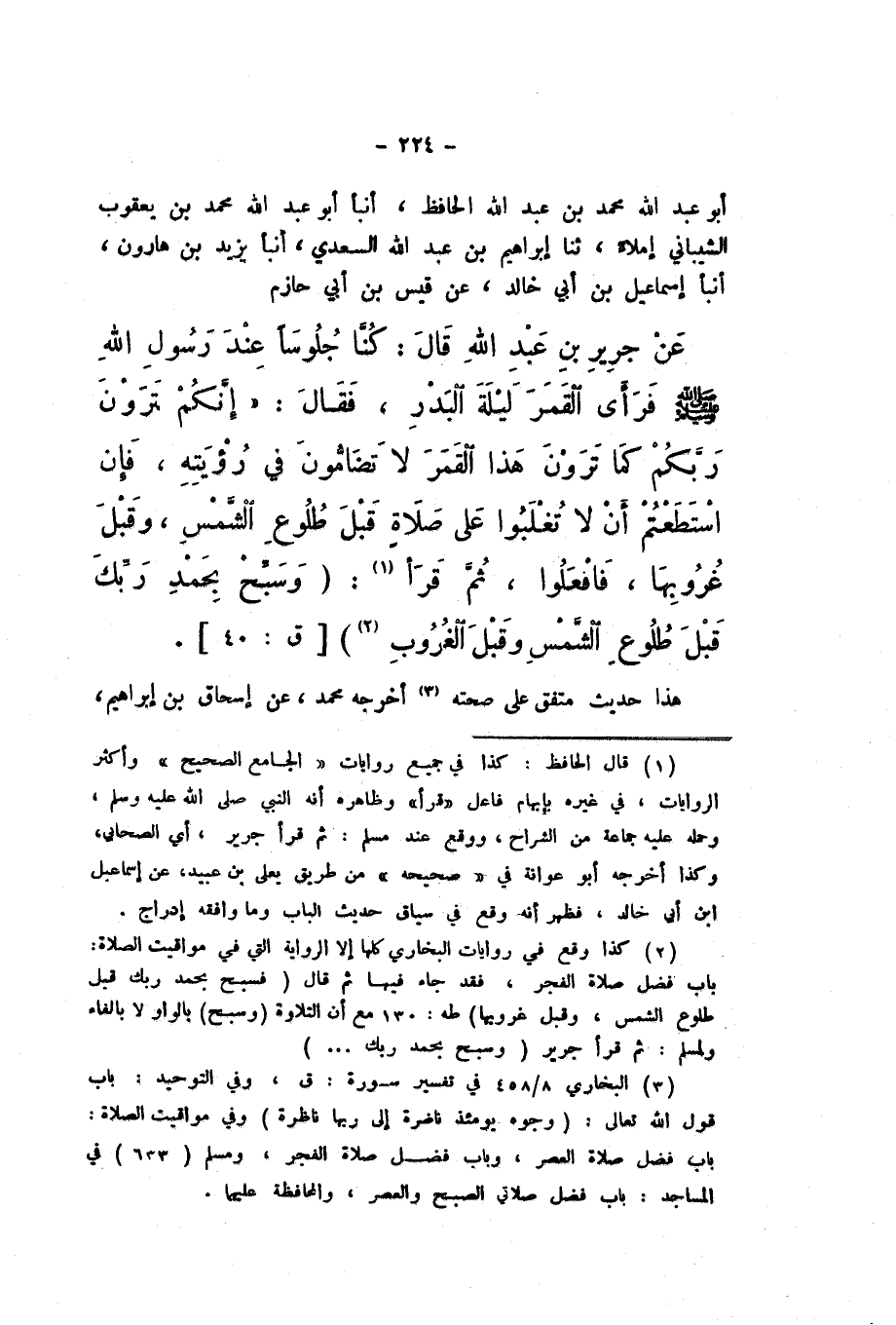 أَبُو عَبْدِ اللَّهِ مُحَمَّدُ بْنُ عَبْدِ اللَّهِ الْحَافِظُ، أَنْبَأَ أَبُو عَبْدِ اللَّهِ بْنُ يَعْقُوبَ الشَّيْبَانِيُّ إِمْلاءً، ثَنَا إِبْرَاهِيمُ بْنُ عَبْدِ اللَّهِ السَّعْدِيُّ، أَنْبَأَ يَزِيدُ بْنُ هَارُونَ، أَنْبَأَ إِسْمَاعِيلُ بْنُ أَبِي خَالِدٍ، عَنْ قَيْسِ بْنِ أَبِي حَازِمٍ، عَنْ جَرِيرِ بْنِ عَبْدِ اللَّهِ، قَالَ: كُنَّا جُلُوسًا عِنْدَ رَسُولِ اللَّهِ صَلَّى اللهُ عَلَيْهِ وَسَلَّمَ، فَرَأَى الْقَمَرَ لَيْلَةَ الْبَدْرِ، فَقَالَ: «إِنَّكُمْ تَرَوْنَ رَبَّكُمْ كَمَا تَرَوْنَ هَذَا الْقَمَرَ لَا تُضَامُونَ فِي رُؤْيَتِهِ، فَإِنِ اسْتَطَعْتُمْ أَنْ لَا تُغْلَبُوا عَلَى صَلاةٍ قَبْلَ طُلُوعِ الشَّمْسِ، وَقَبْلَ غُرُوبِهَا، فَافْعَلُوا»، ثُمَّ قَرَأَ {وَسَبِّحْ بِحَمْدِ رَبِّكَ قَبْلَ طُلُوعِ الشَّمْسِ وَقَبْلَ الْغُرُوبِ} [ق: 39].