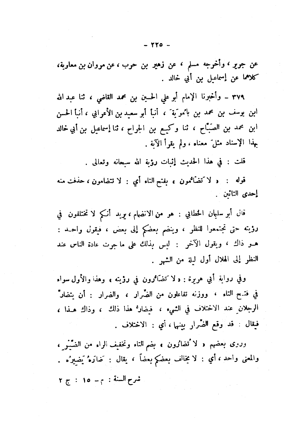 وَفِي رِوَايَةِ أَبِي هُرَيْرَةَ: «لَا تضَارونَ فِي رُؤْيَتِهِ» وَهَذَا وَالأَوَّلُ سَوَاءٌ فِي فَتْحِ التَّاءِ، وَوَزْنُهُ تَفَاعِلُونَ مِنَ الضِّرَارِ.