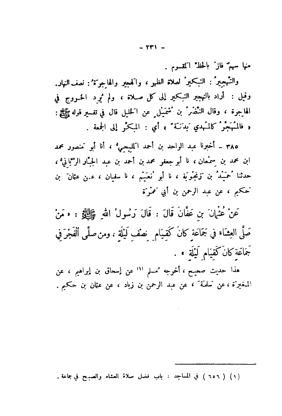 385 - أَخْبَرَنَا عَبْدُ الْوَاحِدِ بْنُ أَحْمَدَ الْمَلِيحِيُّ، أَنَا أَبُو مَنْصُورٍ مُحَمَّدُ بْنُ مُحَمَّدِ بْنِ سَمْعَانَ، نَا أَبُو جَعْفَرٍ مُحَمَّدُ بْنُ أَحْمَدَ بْنِ عَبْدِ الْجَبَّارِ الرَّيَّانِيُّ، حَدَّثَنَا حُمَيْدُ بْنُ زَنْجُوَيْهِ، نَا أَبُو نُعَيْمٍ، نَا سُفْيَانُ، عَنْ عُثْمَانَ بْنِ حَكِيمٍ، عَنْ عَبْدِ الرَّحْمَنِ بْنِ أَبِي عَمْرَةَ، عَنْ عُثْمَانَ بْنِ عَفَّانَ، قَالَ: قَالَ رَسُولُ اللَّهِ صَلَّى اللهُ عَلَيْهِ وَسَلَّمَ: «مَنْ صَلَّى الْعِشَاءَ فِي جَمَاعَةٍ كَانَ كَقِيَامِ نِصْفِ لَيْلَةٍ، وَمَنْ صَلَّى الْفَجْرَ فِي جَمَاعَةٍ كَانَ كَقِيَامِ لَيْلَةٍ».