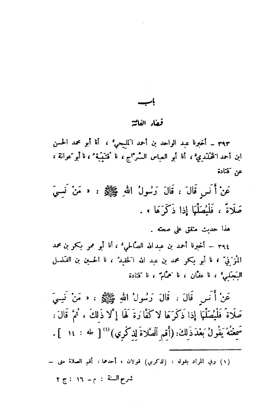 394 - أَخْبَرَنَا أَحْمَدُ بْنُ عَبْدِ اللَّهِ الصَّالِحِيُّ، أَنَا أَبُو عُمَرَ بْنُ مُحَمَّدٍ الْمُزَنِيُّ، نَا أَبُو بَكْرٍ مُحَمَّدُ بْنُ عَبْدِ اللَّهِ الْحَفِيدُ، نَا الْحُسَيْنُ بْنُ الْفَضْلِ الْبَجَلِيُّ، نَا عَفَّانُ، نَا هَمَّامٌ، نَا قَتَادَةُ، عَنْ أَنَسٍ، قَالَ: قَالَ رَسُولُ اللَّهِ صَلَّى اللهُ عَلَيْهِ وَسَلَّمَ: «مَنْ نَسِيَ صَلاةً فَلْيُصَلِّهَا إِذَا ذَكَرَهَا، لَا كَفَّارَةَ لَهَا إِلا ذَلِكَ»، ثُمَّ قَالَ: سَمِعْتُهُ يَقُولُ بَعْدَ ذَلِكَ: {وَأَقِمِ الصَّلاةَ لِذِكْرِي} [طه: 14].