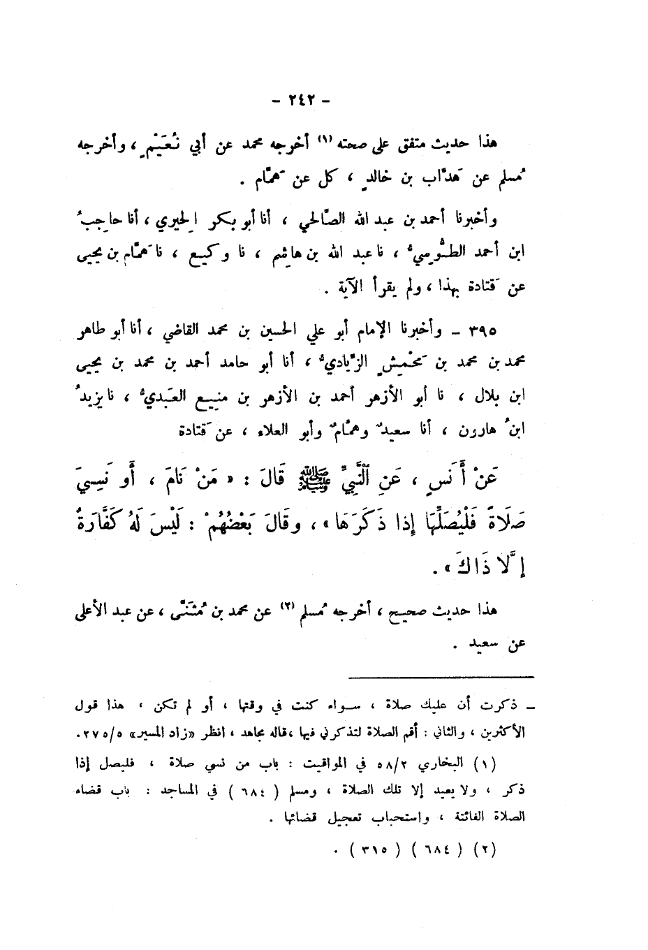395 - وَأَخْبَرَنَا الإِمَامُ أَبُو عَلِيٍّ الْحُسَيْنُ بْنُ مُحَمَّدٍ الْقَاضِي، أَنَا أَبُو طَاهِرٍ مُحَمَّدُ بْنُ مُحَمَّدِ بْنِ مَحْمِشٍ الزِّيَادِيُّ، أَنَا أَبُو حَامِدٍ أَحْمَدُ بْنُ مُحَمَّدِ بْنِ يَحْيَى بْنِ بِلالٍ، نَا أَبُو الأَزْهَرِ أَحْمَدُ بْنُ الأَزْهَرِ بْنِ مَنِيعٍ الْعَبْدِيُّ، نَا يَزِيدُ بْنُ هَارُونَ، أَنَا سَعِيدٌ، وَهَمَّامٌ، وَأَبُو الْعَلاءِ، عَنْ قَتَادَةَ، عَنْ أَنَسٍ، عَنِ النَّبِيِّ صَلَّى اللهُ عَلَيْهِ وَسَلَّمَ، قَالَ: «مَنْ نَامَ، أَوْ نَسِيَ صَلاةً، فَلْيُصَلِّهَا إِذَا ذَكَرَهَا»، وَقَالَ بَعْضُهُمْ: لَيْسَ لَهُ كَفَّارَةٌ إِلا ذَاكَ.