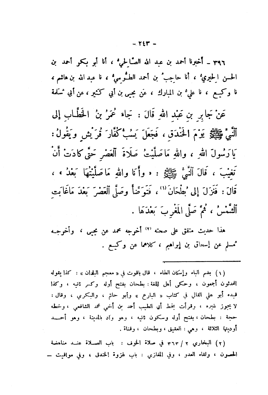 396 - أَخْبَرَنَا أَحْمَدُ بْنُ عَبْدِ اللَّهِ الصَّالِحِيُّ، أَنَا أَبُو بَكْرٍ أَحْمَدُ بْنُ الْحَسَنِ الْحِيرِيُّ، أَنَا حَاجِبُ بْنُ أَحْمَدَ الطُّوسِيُّ، نَا عَبْدُ اللَّهِ بْنُ هَاشِمٍ، نَا وَكِيعٌ، نَا عَلِيُّ بْنُ الْمُبَارَكِ، عَنْ يَحْيَى بْنِ أَبِي كَثِيرٍ، عَنْ أَبِي سَلَمَةَ، عَنْ جَابِرِ بْنِ عَبْدِ اللَّهِ، قَالَ: جَاءَ عُمَرُ بْنُ الْخَطَّابِ إِلَى النَّبِيِّ صَلَّى اللهُ عَلَيْهِ وَسَلَّمَ يَوْمَ الْخَنْدَقِ، فَجَعَلَ يَسُبُّ كُفَّارَ قُرَيْشٍ، وَيَقُولُ: يَا رَسُولَ اللَّهِ، وَاللَّهِ مَا صَلَّيْتُ صَلاةَ الْعَصْرِ حَتَّى كَادَتْ أَنْ تَغِيبَ، قَالَ النَّبِيُّ صَلَّى اللهُ عَلَيْهِ وَسَلَّمَ: «وَأَنَا وَاللَّهِ مَا صَلَّيْتُهَا بَعْدُ»، قَالَ: فَنَزَلَ إِلَى بُطْحَانَ، فَتَوَضَّأَ وَصَلَّى الْعَصْرَ بَعْدَ مَا غَابَتِ الشَّمْسُ، ثُمَّ صَلَّى الْمَغْرِبِ بَعْدَهَا.