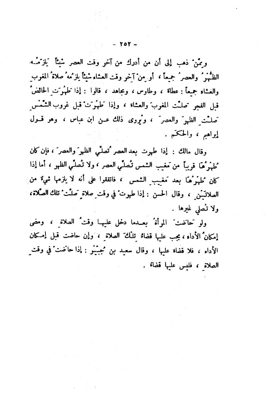 وَمِمَّنْ ذَهَبَ إِلَى أَنَّ مَنْ أَدْرَكَ مِنْ آخِرِ وَقْتِ الْعَصْرِ شَيْئًا يَلْزَمُهُ الظُّهْرُ وَالْعَصْرُ جَمِيعًا، أَوْ مِنْ آخِرِ وَقْتِ الْعِشَاءِ شَيْئًا يَلْزَمُهُ صَلاةُ الْمَغْرِبِ وَالْعِشَاءِ جَمِيعًا: عَطَاءٌ، وَطَاوُسٌ، وَمُجَاهِدٌ، قَالُوا: إِذَا طَهُرَتِ الْحَائِضُ قَبْلَ الْفَجْرِ صَلَّتِ الْمَغْرِبَ، وَالْعِشَاءَ، وَإِذَا طَهُرَتْ قَبْلَ غُرُوبِ الشَّمْسِ صَلَّتِ الظُّهْرَ وَالْعَصْرَ، وَيُرْوَى ذَلِكَ عَنِ ابْنِ عَبَّاسٍ، وَهُوَ قَوْلُ إِبْرَاهِيمَ، وَالْحَكَمِ.