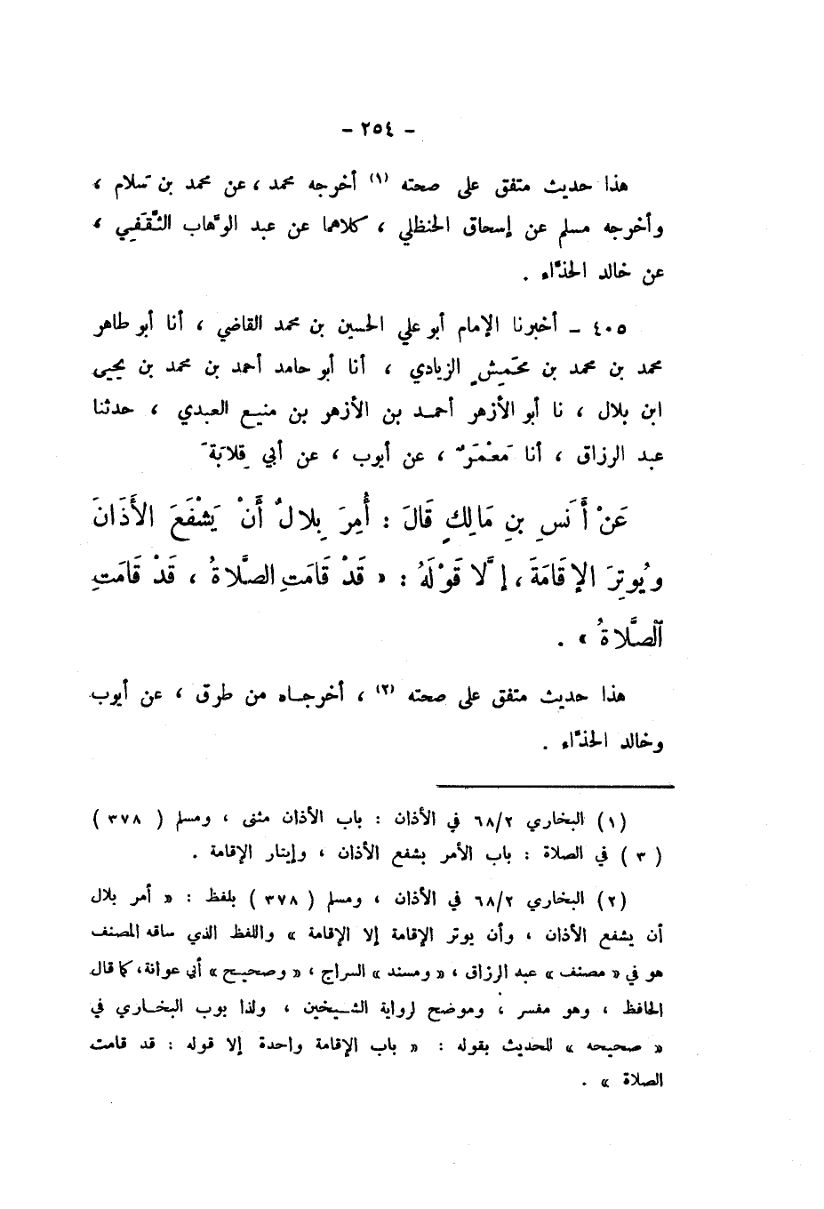 405 - أَخْبَرَنَا الإِمَامُ أَبُو عَلِيٍّ الْحُسَيْنُ بْنُ مُحَمَّدٍ الْقَاضِي، أَنا أَبُو طَاهِرٍ مُحَمَّدُ بْنُ مُحَمَّدِ بْنِ مَحْمِشٍ الزِّيَادِيُّ، أَنَا أَبُو حَامِدٍ أَحْمَدُ بْنُ مُحَمَّدِ بْنِ يَحْيَى بْنِ بِلالٍ، نَا أَبُو الأَزْهَرِ أَحْمَدُ بْنُ الأَزْهَرِ بْنِ مَنِيعٍ الْعَبْدِيُّ، حَدَّثَنَا عَبْدُ الرَّزَّاقِ، أَنَا مَعْمَرٌ، عَنْ أَيُّوبَ، عَنْ أَبِي قِلابَةَ، عَنْ أَنَسِ بْنِ مَالِكٍ، قَالَ: أُمِرَ بِلالٌ أَنْ يَشْفَعَ الأَذَانَ وَيُوتِرَ الإِقَامَةَ، إِلا قَوْلَهُ «قَدْ قَامَتِ الصَّلاةُ، قَدْ قَامَتِ الصَّلاةُ».