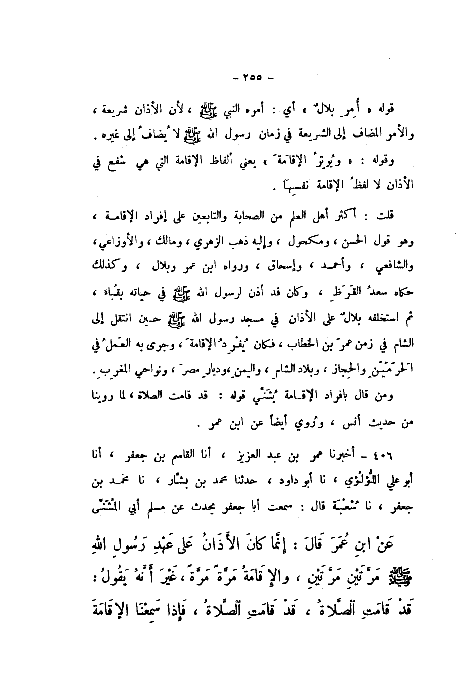 406 - أَخْبَرَنَا عُمَرُ بْنُ عَبْدِ الْعَزِيزِ، أَنَا الْقَاسِمُ بْنُ جَعْفَرٍ، أَنَا أَبُو عَلِيٍّ اللُّؤْلُئِيُّ، نَا أَبُو دَاوُدَ، حَدَّثَنَا مُحَمَّدُ بْنُ بَشَّارٍ، نَا مُحَمَّدُ بْنُ جَعْفَرٍ، نَا شُعْبَةُ، قَالَ: سَمِعْتُ أَبَا جَعْفَرٍ يُحَدِّثُ، عَنْ مُسْلِمِ أَبِي الْمُثَنَّى، عَنِ ابْنِ عُمَرَ، قَالَ: إِنَّمَا كَانَ الأَذَانُ عَلَى عَهْدِ رَسُولِ اللَّهِ صَلَّى اللهُ عَلَيْهِ وَسَلَّمَ مَرَّتَيْنِ مَرَّتَيْنِ، وَالإِقَامَةُ مَرَّةً مَرَّةً، غَيْرَ أَنَّهُ يَقُولُ: «قَدْ قَامَتِ الصَّلاةُ، قَدْ قَامَتِ الصَّلاةُ»، فَإِذَا سَمِعْنَا الإِقَامَةَ