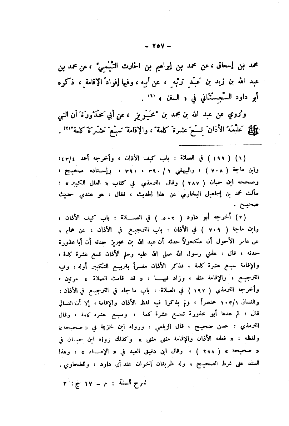 مُحَمَّدِ بْنِ إِسْحَاقَ، عَنْ مُحَمَّدِ بْنِ إِبْرَاهِيمَ بْنِ الْحَارِثِ التَّيْمِيِّ، عَنْ مُحَمَّدِ بْنِ عَبْدِ اللَّهِ بْنِ زَيْدِ بْنِ عَبْدِ رَبِّهِ، عَنْ أَبِيهِ، وَفِيهَا إِفْرَادُ الإِقَامَةِ، ذَكَرَهُ أَبُو دَاوُدَ السِّجِسْتَانِيُّ فِي السُّنَنِ.