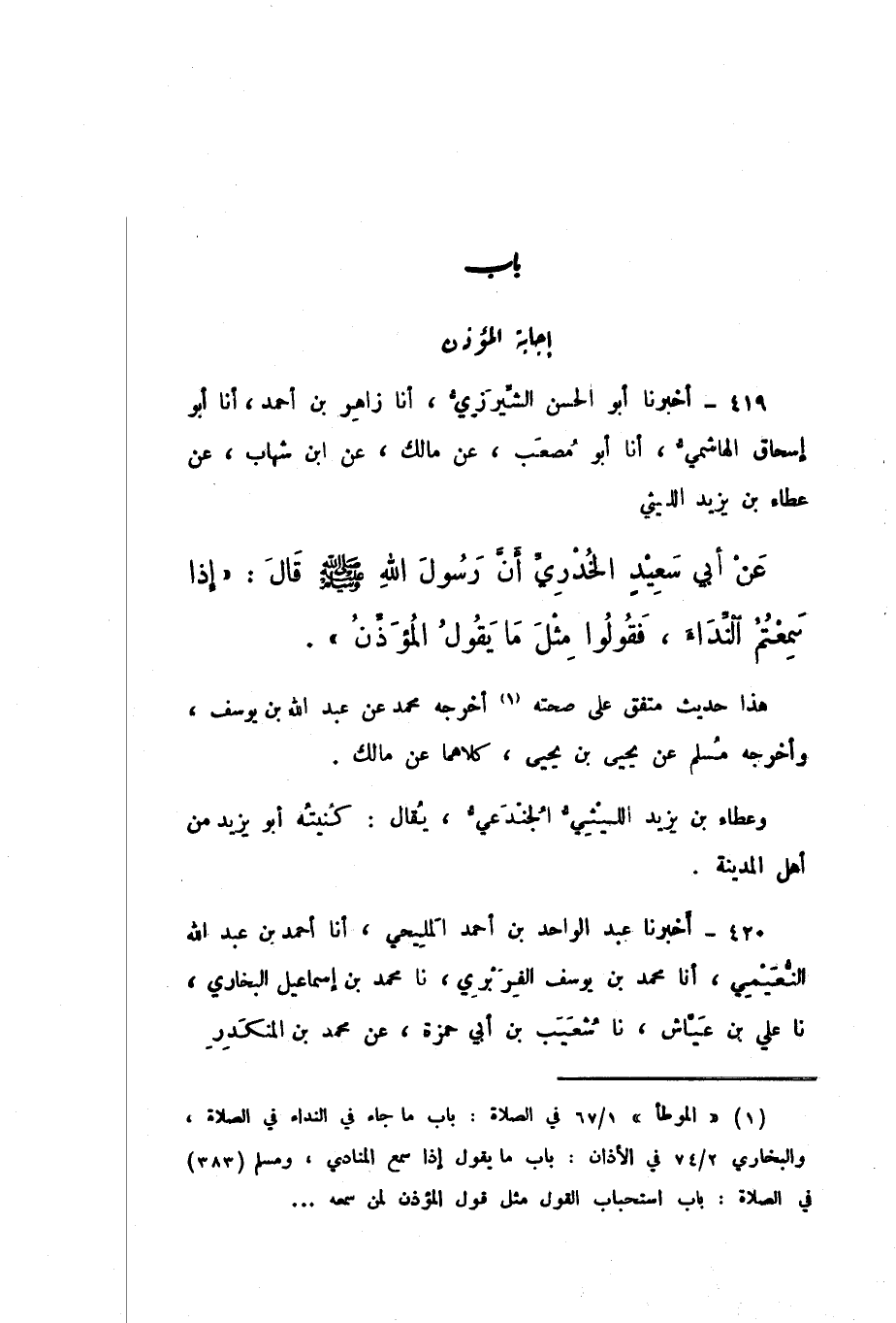 419 - أَخْبَرَنَا أَبُو الْحَسَنِ الشِّيرَزِيُّ، أَنَا زَاهِرُ بْنُ أَحْمَدَ، أَنَا أَبُو إِسْحَاقَ الْهَاشِمِيُّ، أَنَا أَبُو مُصْعَبٍ، عَنْ مَالِكٍ، عَنِ ابْنِ شِهَابٍ، عَنْ عَطَاءِ بْنِ يَزِيدَ اللَّيْثِيِّ، عَنْ أَبِي سَعِيدٍ الْخُدْرِيِّ، أَنَّ رَسُولَ اللَّهِ صَلَّى اللهُ عَلَيْهِ وَسَلَّمَ، قَالَ: «إِذَا سَمِعْتُمُ النِّدَاءَ، فَقُولُوا مِثْلَ مَا يَقُولُ الْمُؤَذِّنُ».