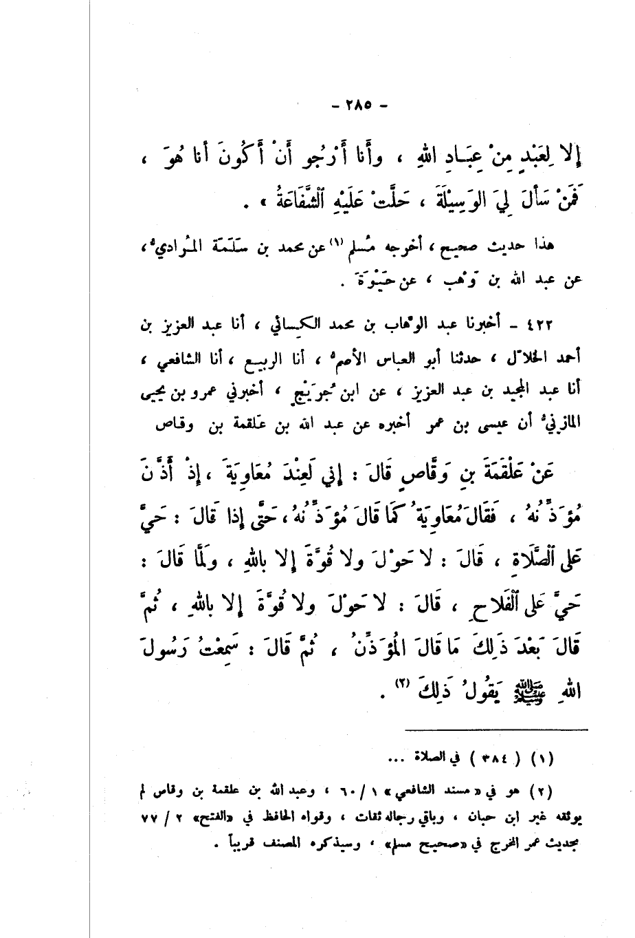 422 - أَخْبَرَنَا عَبْدُ الْوَهَّابِ بْنُ مُحَمَّدٍ الْكِسَائِيُّ، أَنَا عَبْدُ الْعَزِيزِ بْنُ أَحْمَدَ الْخَلالُ، حَدَّثَنَا أَبُو الْعَبَّاسِ الأَصَمُّ، أَنَا الرَّبِيعُ، أَنَا الشَّافِعِيُّ، أَنَا عَبْدُ الْمَجِيدِ بْنُ عَبْدِ الْعَزِيزِ، عَنِ ابْنِ جُرَيْجٍ، أَخْبَرَنِي عَمْرُو بْنُ يَحْيَى الْمَازِنِيُّ، أَنَّ عِيسَى بْنَ عُمَرَ أَخْبَرَهُ، عَنْ عَبْدِ اللَّهِ بْنِ عَلْقَمَةَ بْنِ وَقَّاصٍ، عَنْ عَلْقَمَةَ بْنِ وَقَّاصٍ، قَالَ: إِنِّي لَعِنْدَ مُعَاوِيَةَ، إِذْ أَذَّنَ مُؤَذِّنُهُ، فَقَالَ مُعَاوِيَةُ كَمَا قَالَ مُؤَذِّنُهُ، حَتَّى إِذَا قَالَ: حَيَّ عَلَى الصَّلاةِ، قَالَ: " لَا حَوْلَ وَلا قُوَّةَ إِلا بِاللَّهِ، وَلَمَّا قَالَ: حَيَّ عَلَى الْفَلاحِ، قَالَ: لَا حَوْلَ وَلا قُوَّةَ إِلا بِاللَّهِ، ثُمَّ قَالَ بَعْدَ ذَلِكَ مَا قَالَ الْمُؤَذِّنُ، ثُمَّ قَالَ: سَمِعْتُ رَسُولَ اللَّهِ صَلَّى اللهُ عَلَيْهِ وَسَلَّمَ يَقُولُ ذَلِكَ "